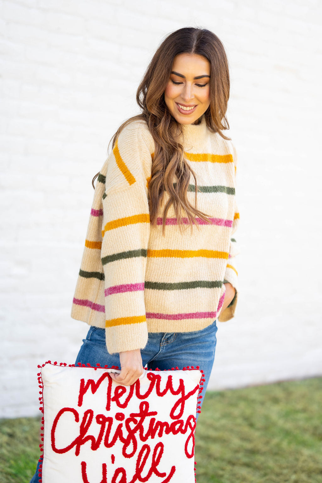 Striped Wide Sleeve Mock Neck Sweater