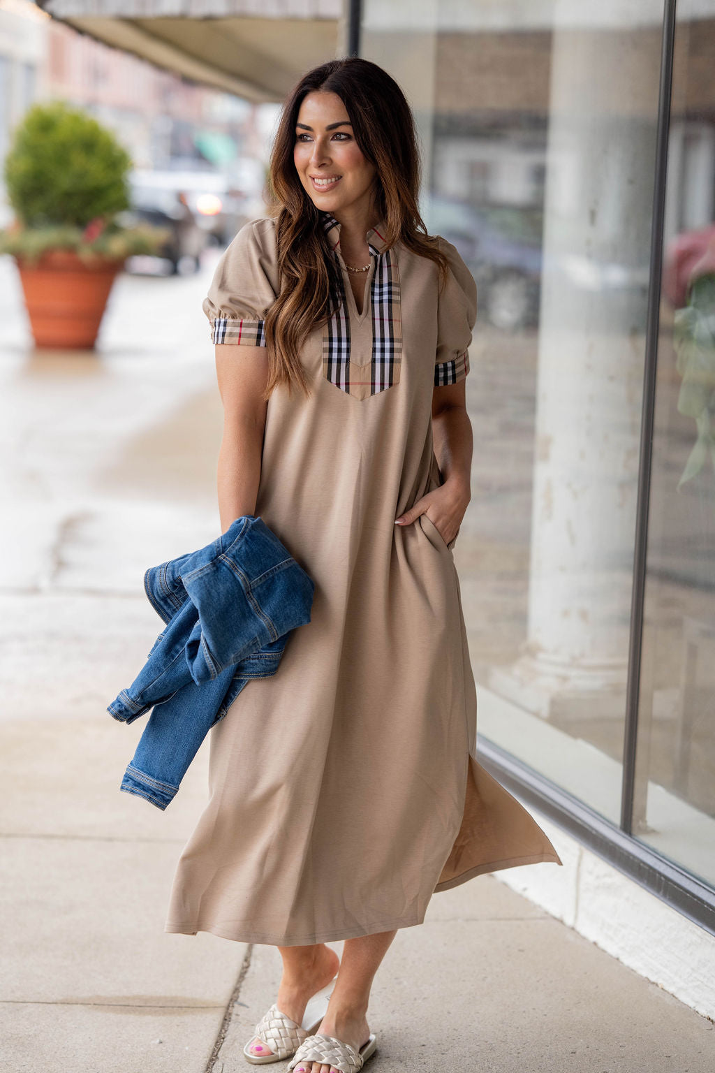 Effortlessly polished and endlessly versatile, this dress blends timeless style with everyday comfort. Featuring a relaxed, flowy silhouette and subtle plaid trim details, it offers a refined look that feels both modern and classic.
