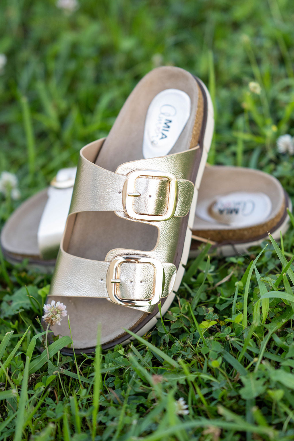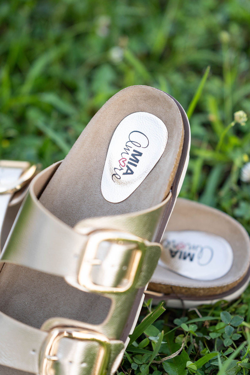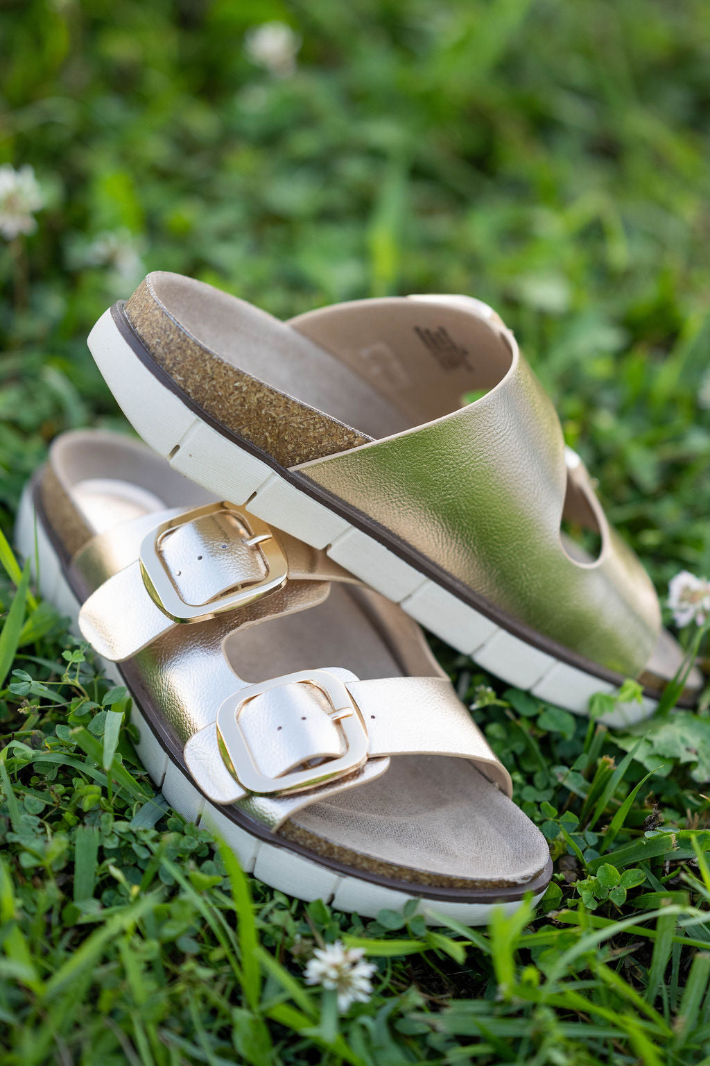 A take on the trendy double buckle but with ultimate comfort. This everyday sandal features vegan suede and a sneaker bottom sole. Now available in wide width, ensuring the perfect match for every foot, season after season.