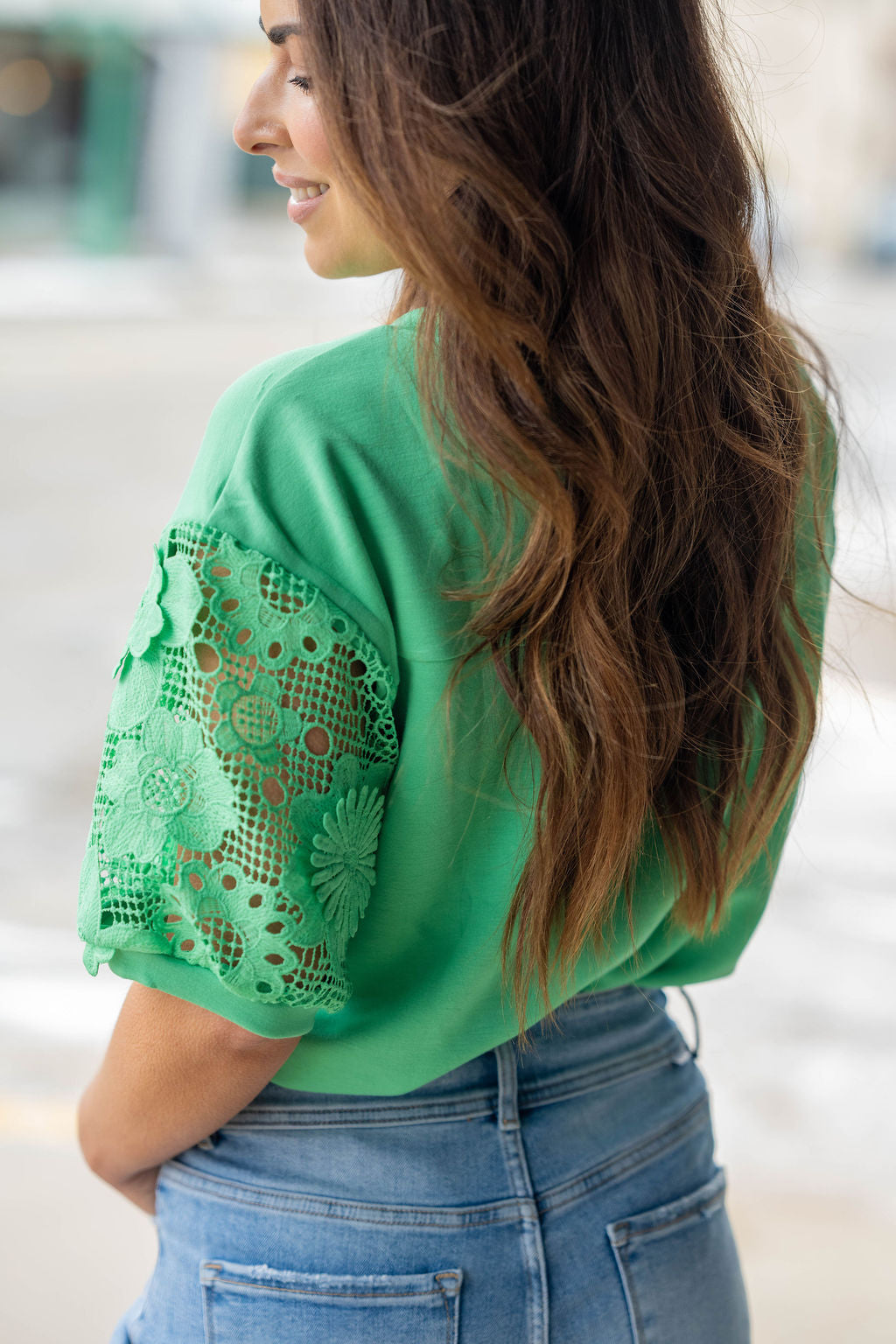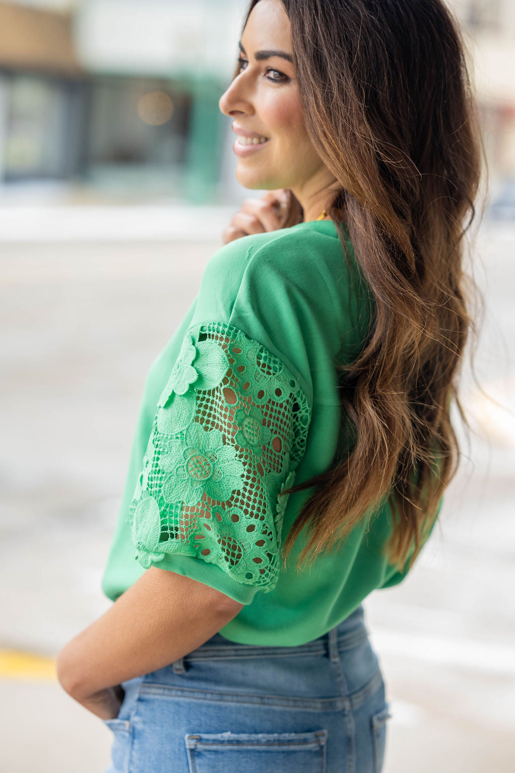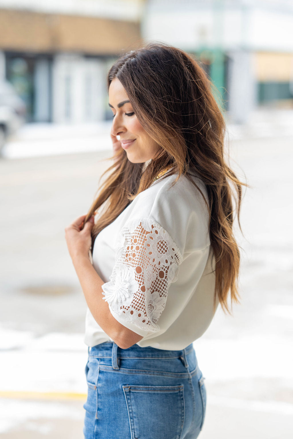 A sweet blend of simplicity and stand-out detail. This timeless blouse features a clean, smooth body paired with the most beautiful floral lace sleeves—dimensional, airy, and full of feminine charm.