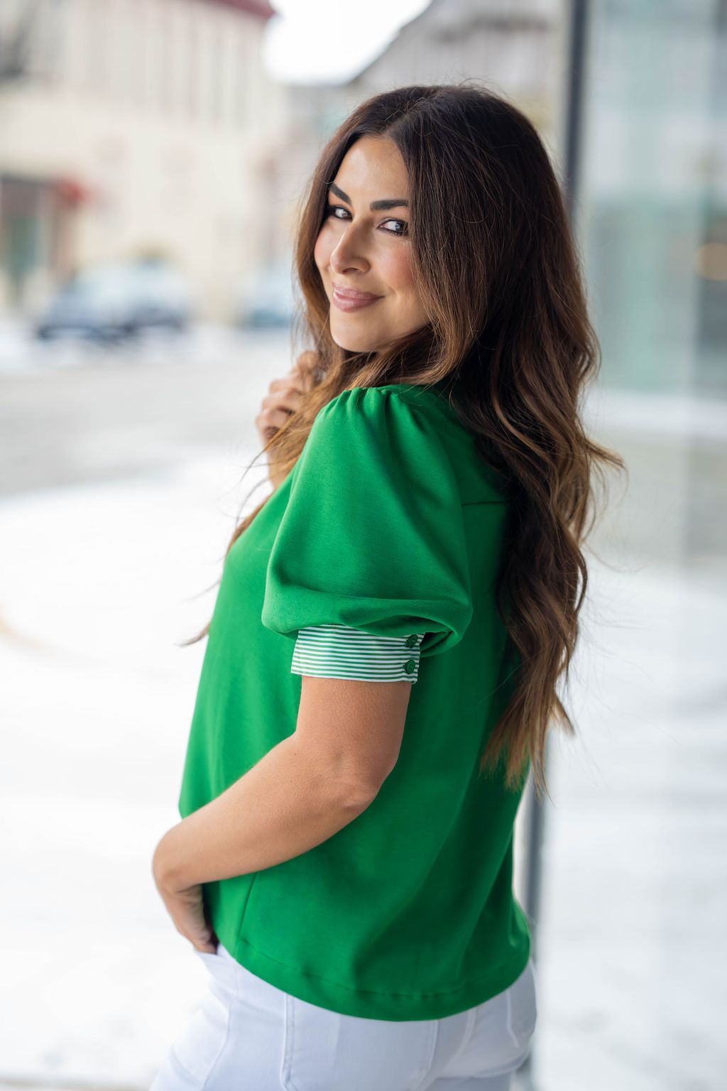 - Striped trim detail on neckline + sleeves