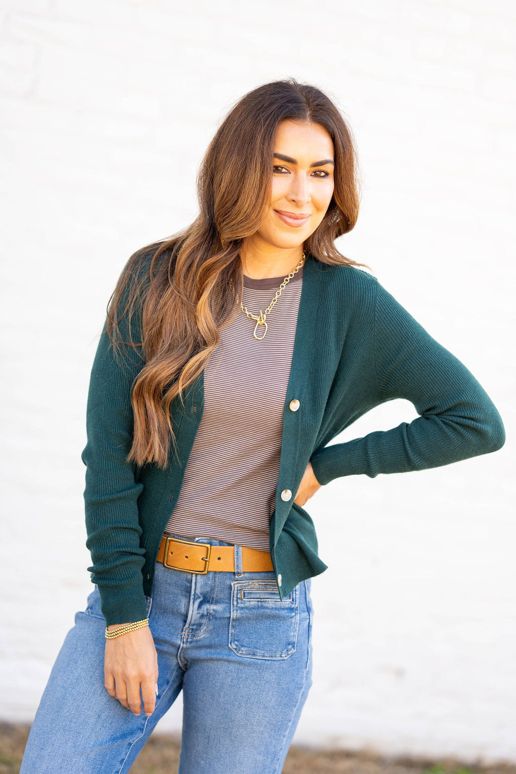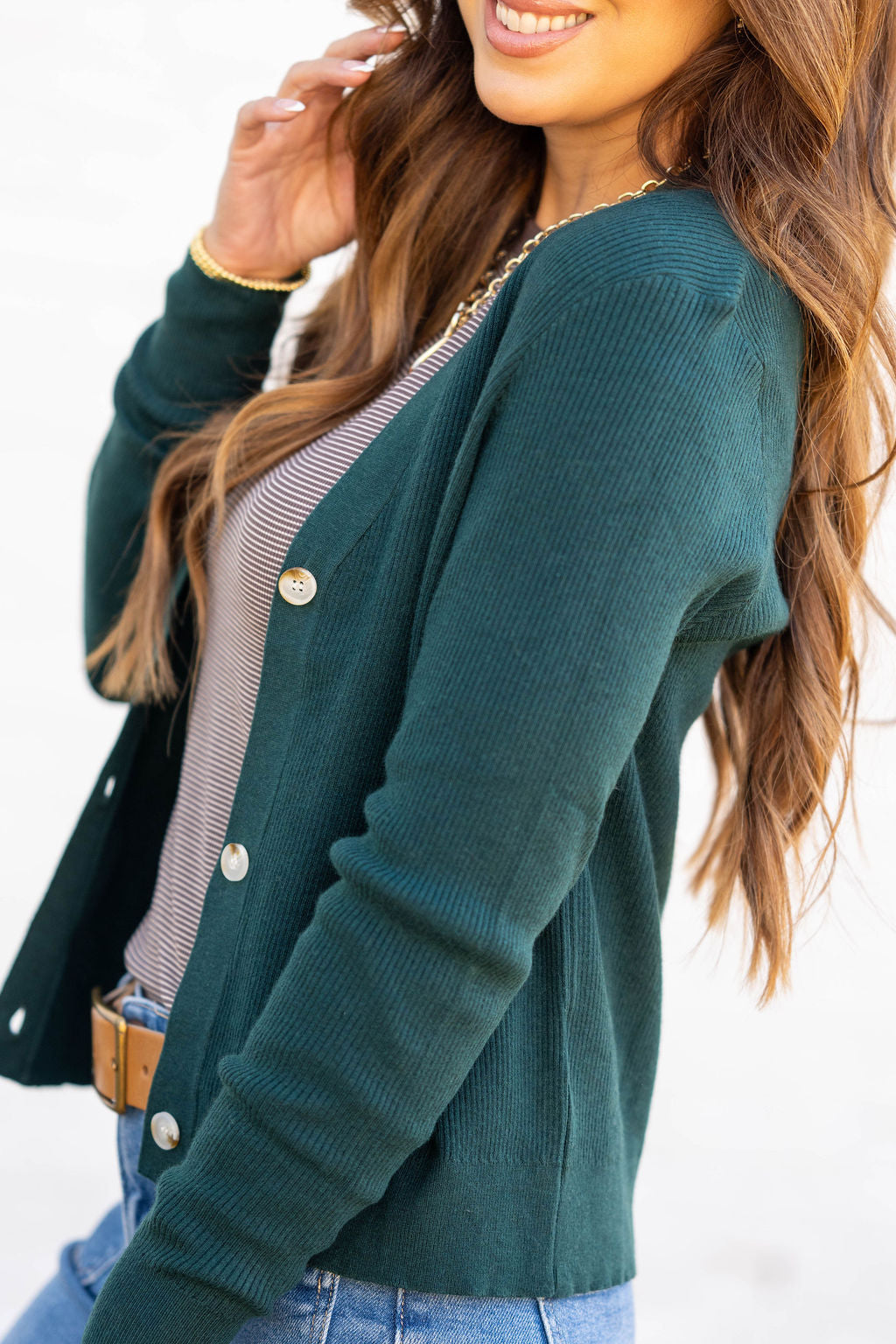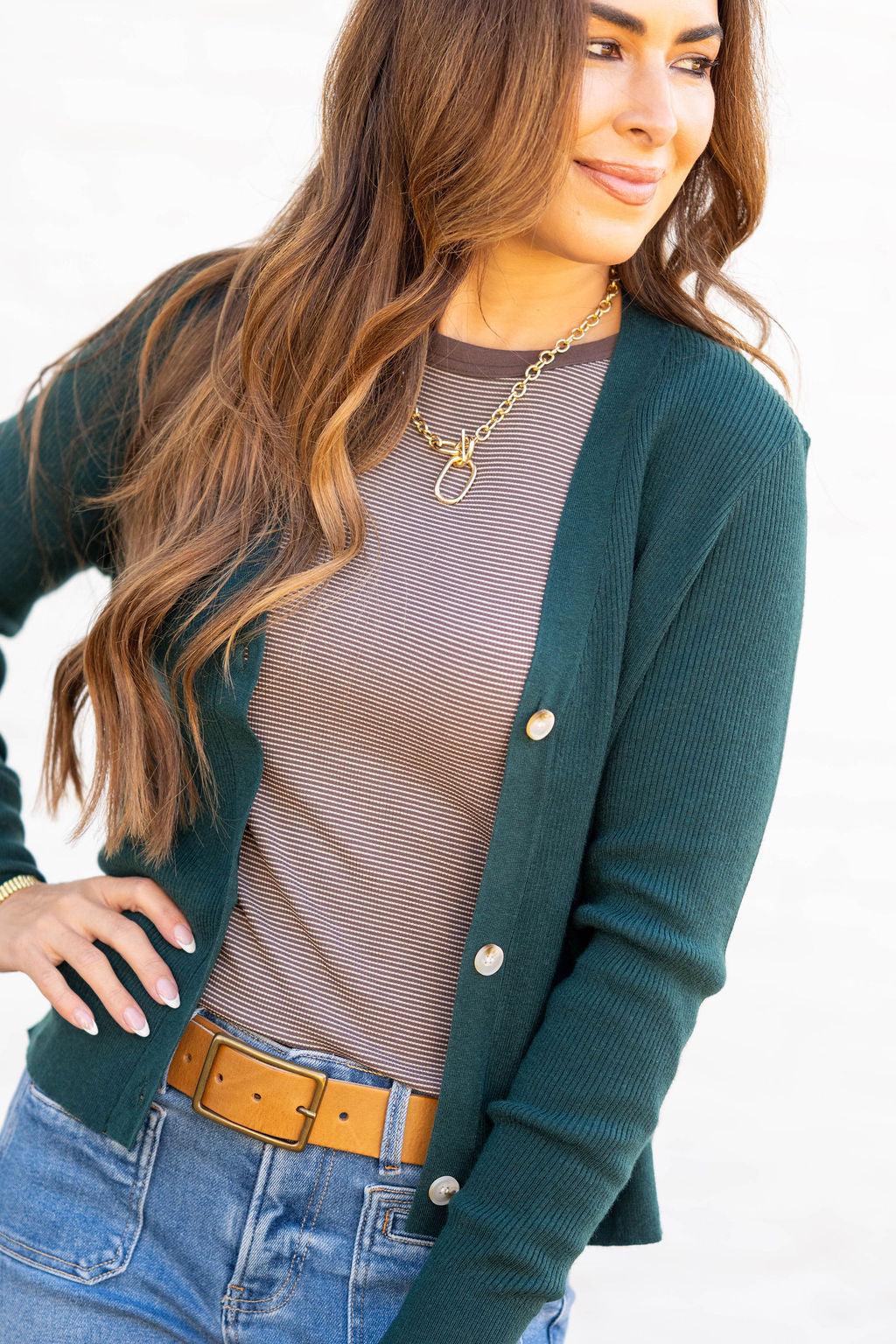 A timeless cardigan that layers effortlessly over any look. With its classic button front and soft ribbed texture, it’s a piece that keeps you cozy while still feeling polished.