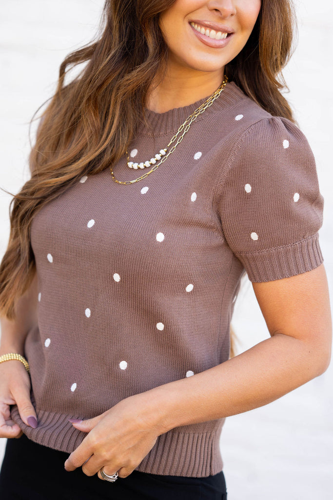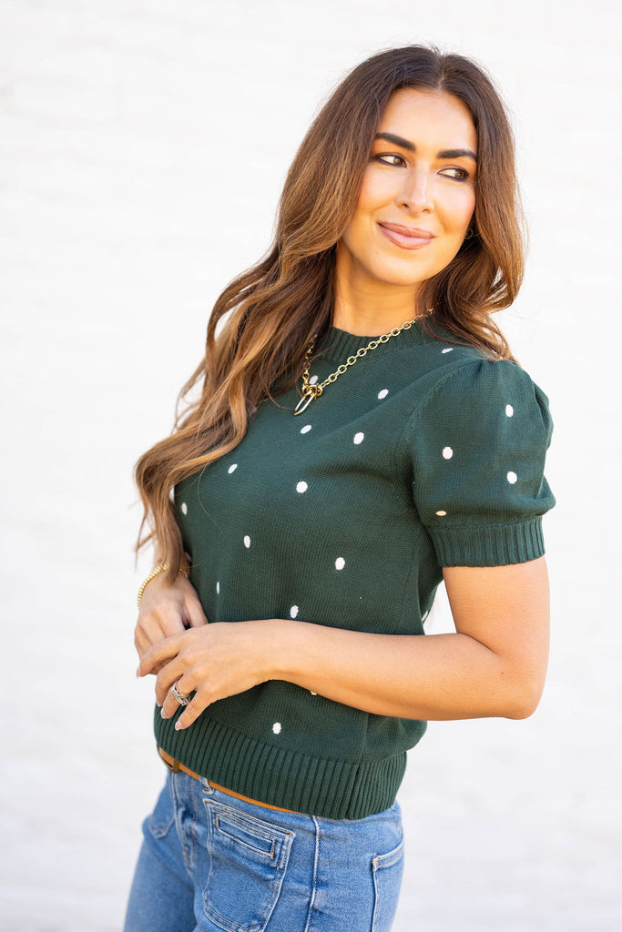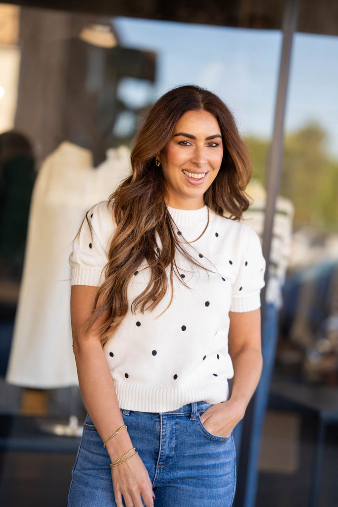 Playful, polished, and perfectly timeless is that pop of color your wardrobe’s been craving. The soft knit and puff sleeves bring a feminine twist to this classic polka-dot style that feels just as sweet for spring as it does for the holidays.