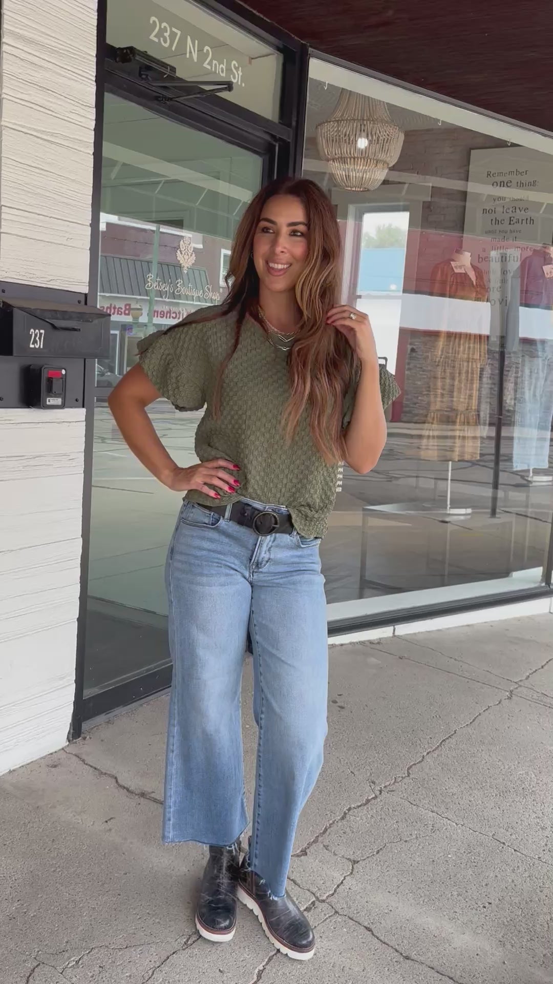 Add a pop of color and texture to your wardrobe with this blouse! The bold texture and the bell sleeve details are unlike all of the rest! We love that this can be paired with a skirt or shorts in the warmer months or layered with a blazer, cardigan, or jacket in the cooler ones!