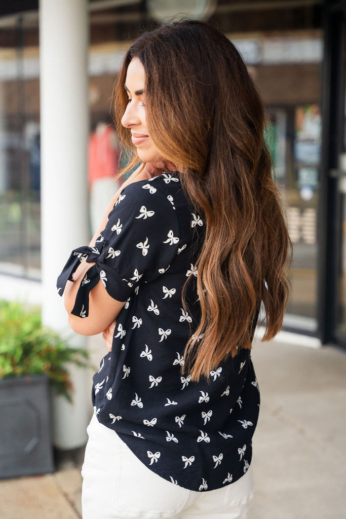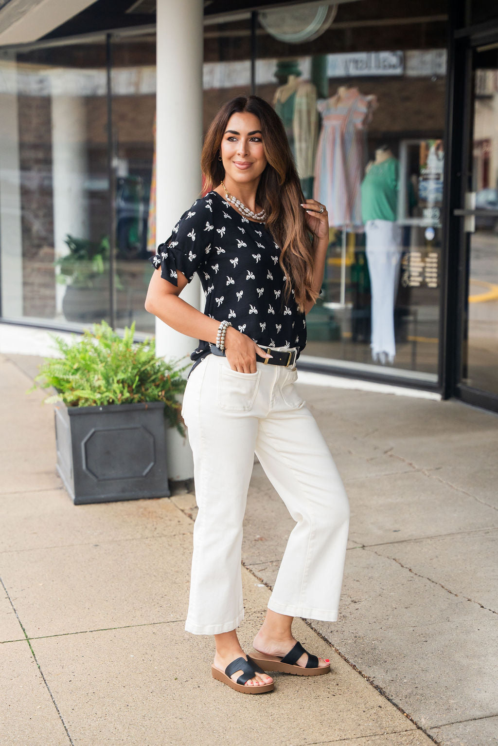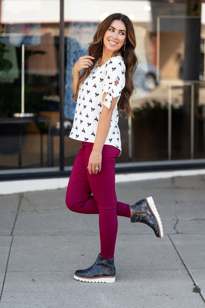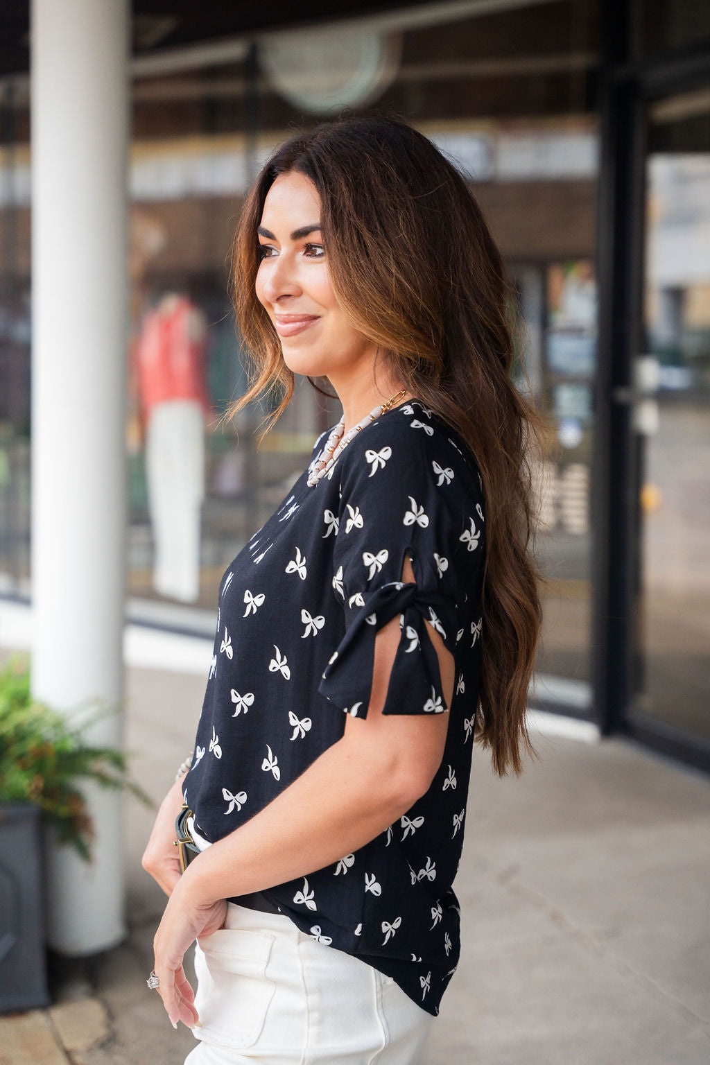 Bows are super trendy right now and we see why! The bow print on this blouse gives it a fun, feminine, and flirty vibe! The tie accented sleeves allow you to wear this in the warmer months or layer with a blazer, cardigan, or jacket in the cooler ones. We love that you can tuck this into a skirt, pair with your favorite denim, throw on with some joggers, or elevate the whole look with a bold-colored Betsey's Jegging! The possibilities are endless.