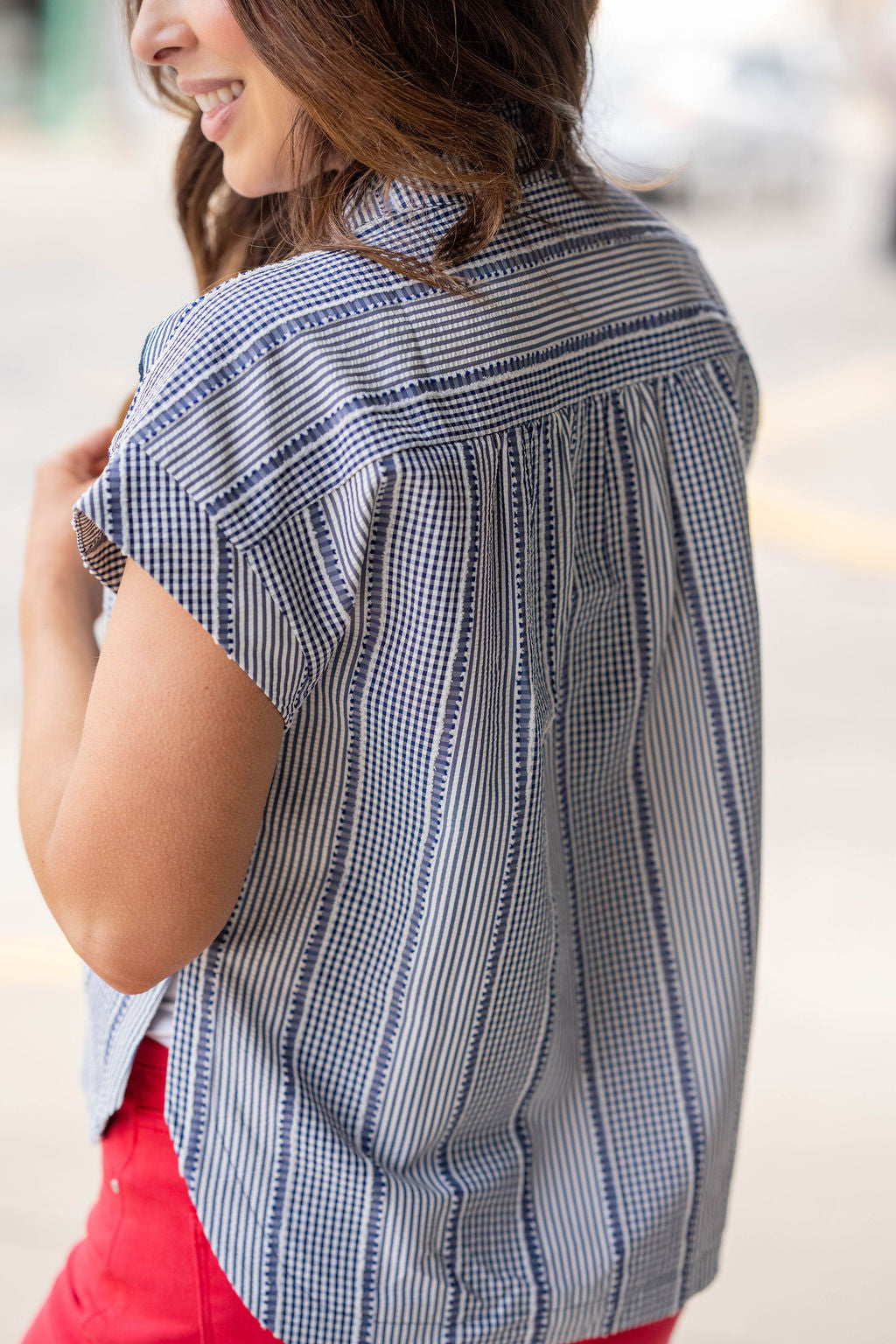 A little classic, a little playful—this blouse brings the best of both worlds. Designed with a mix of delicate stripe patterns and finished with feminine ruffle detailing down the front, it adds texture and interest to your everyday look. The soft structure and cap sleeves give it a polished feel while still keeping things light and easy to wear.