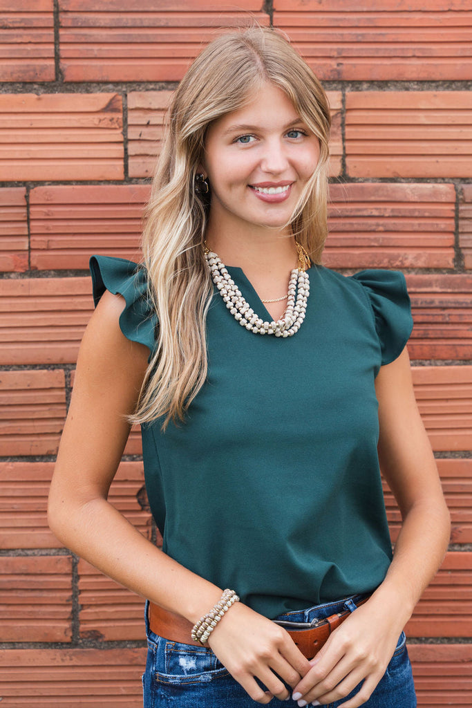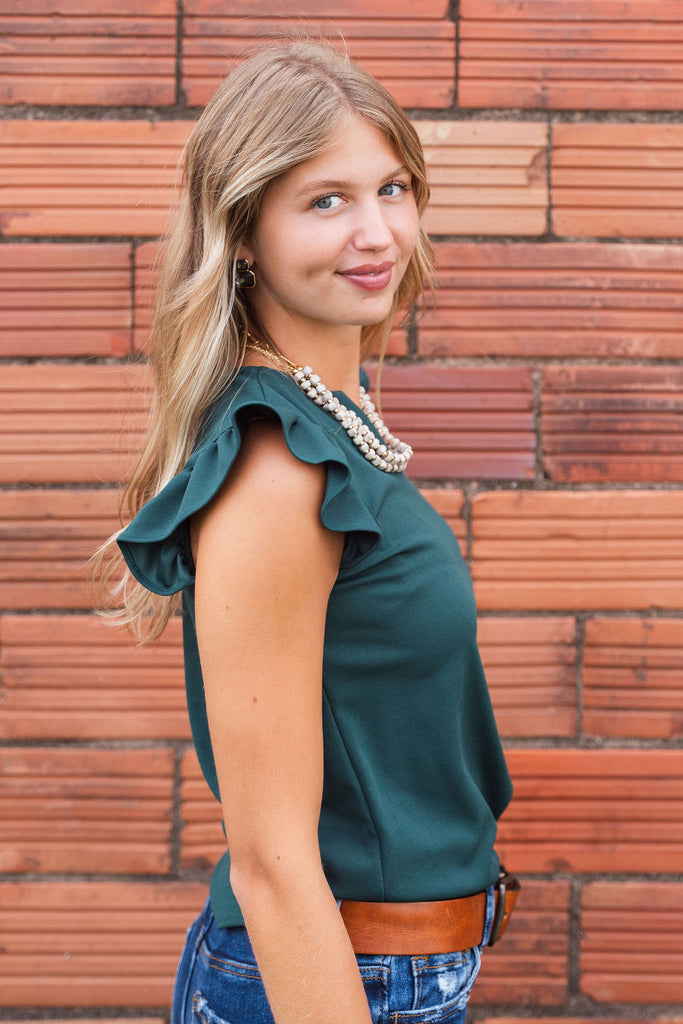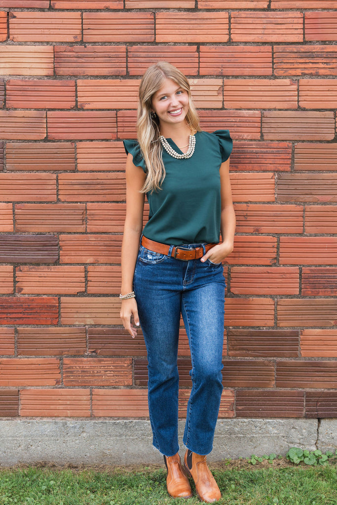 An absolute staple piece for your wardrobe! This blouse features a fun flutter trim and v-neckline. Pair with shorts or a skirt in the warmer months or use as a base for all of your blazers, cardigans, and jackets in the cooler ones. This is simple enough to dress up or down for everyday wear.