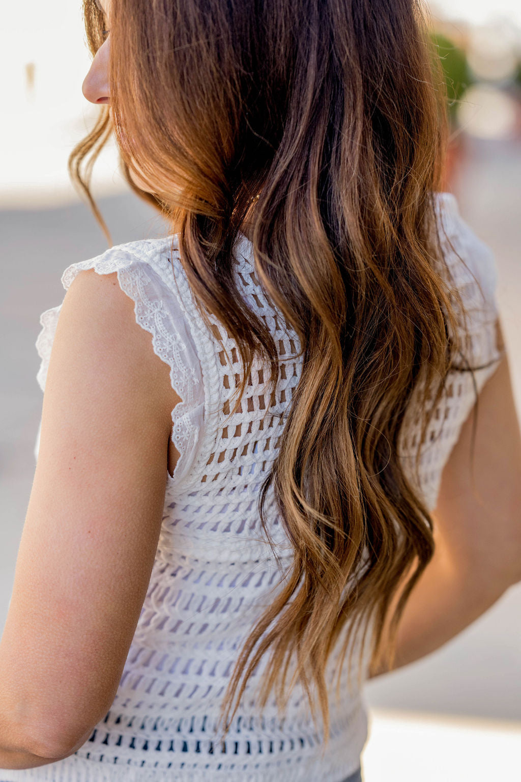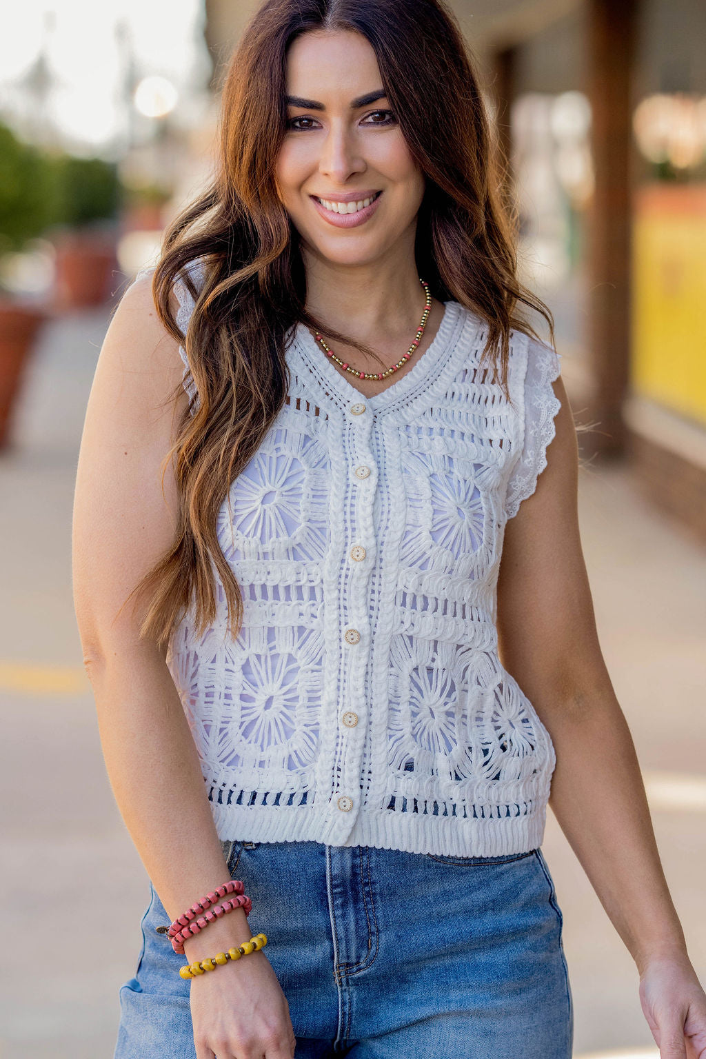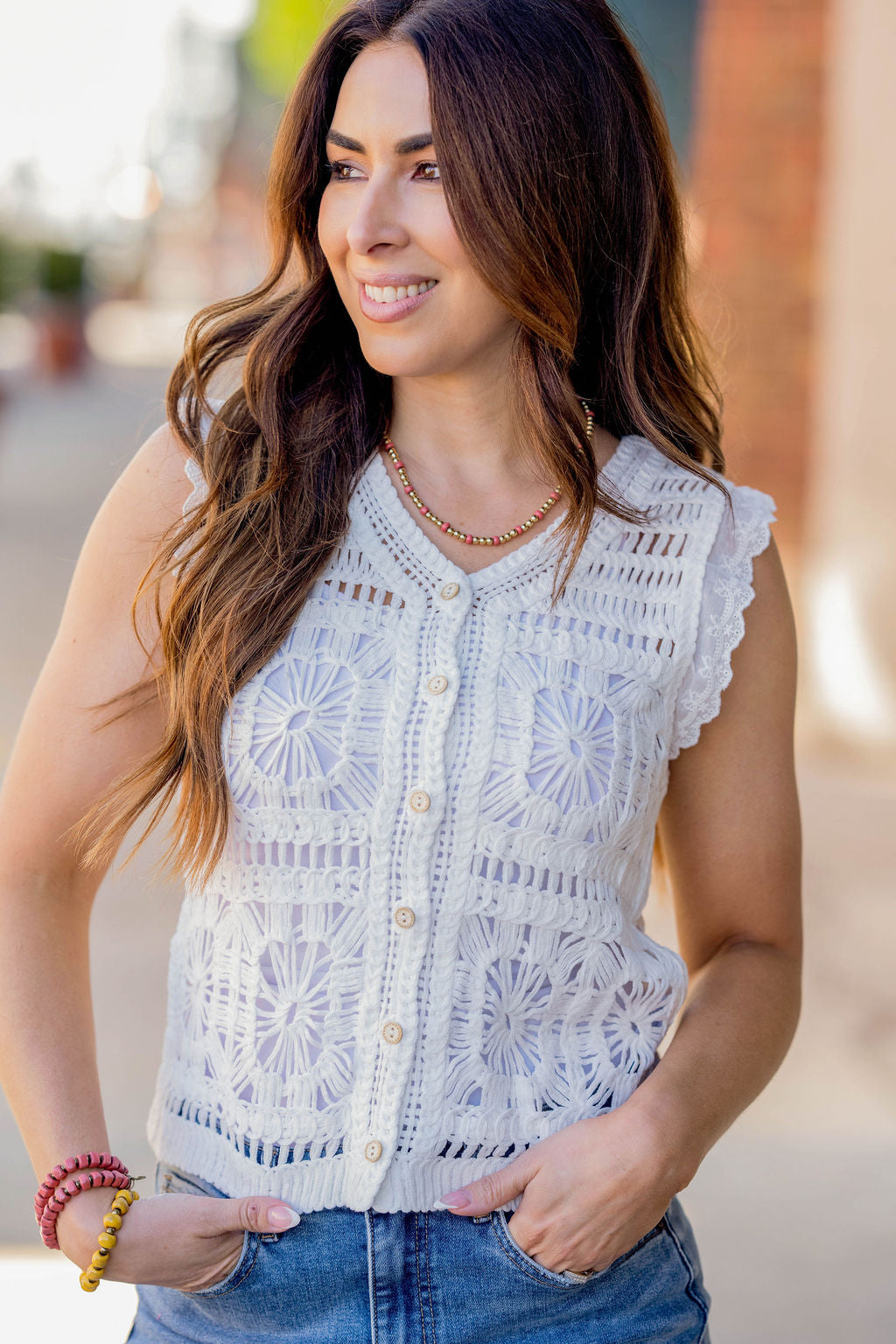 Knit tops aren’t just for the cooler months! This tank can easily be paired with shorts or a skirt for the warmer ones too! We love the crocheted look with the button detailing and eyelet trim of this tank! Add a cardigan, blazer, or jacket for the cooler months.