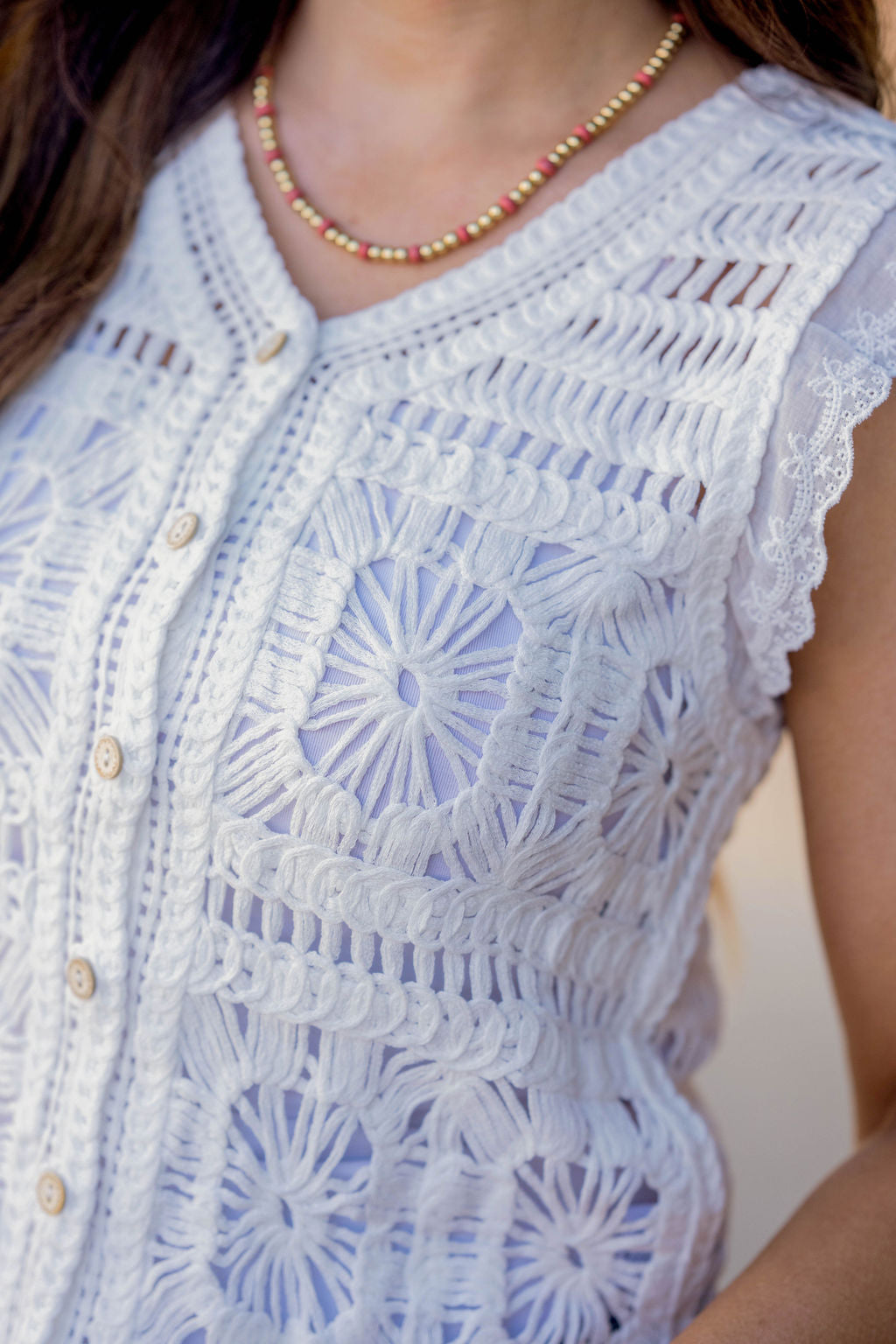 Crocheted Eyelet Trim Button Down Tank