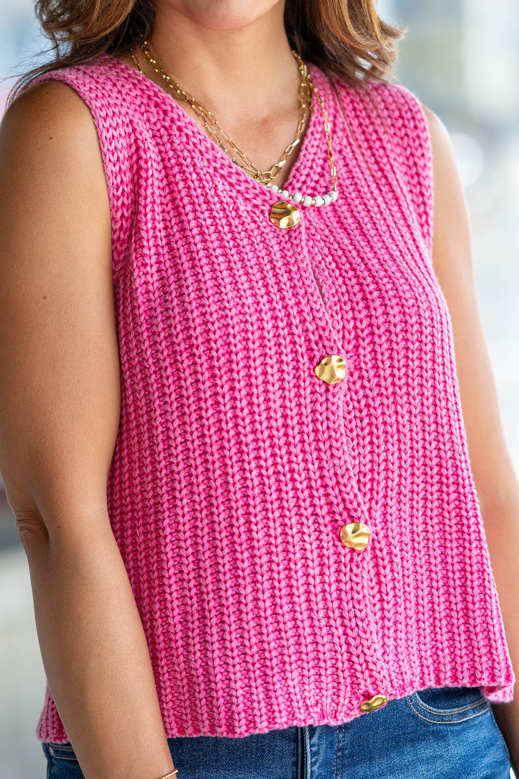 With the knit feel and the detailed buttons, this tank is unlike all the rest! Pair with a skirt or shorts in the warmer months or use as a base for your blazers, cardigans, or jackets for the cooler ones! This can be dressed up or down with ease, making it a staple piece for your wardrobe!