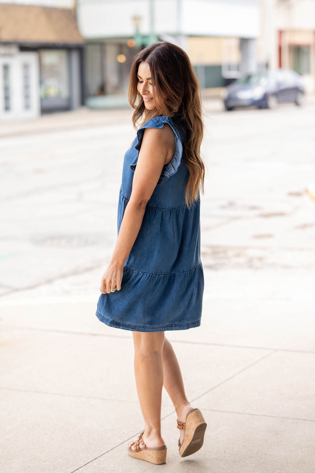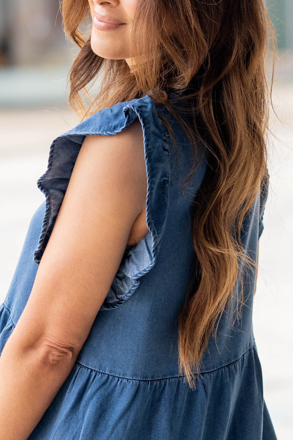 Effortless, breezy, and full of charm—this tiered denim dress is your throw-on-and-go favorite for sunny days. Designed with a relaxed silhouette, soft lightweight denim, and flutter sleeves, it brings a feminine feel to an easy everyday look.