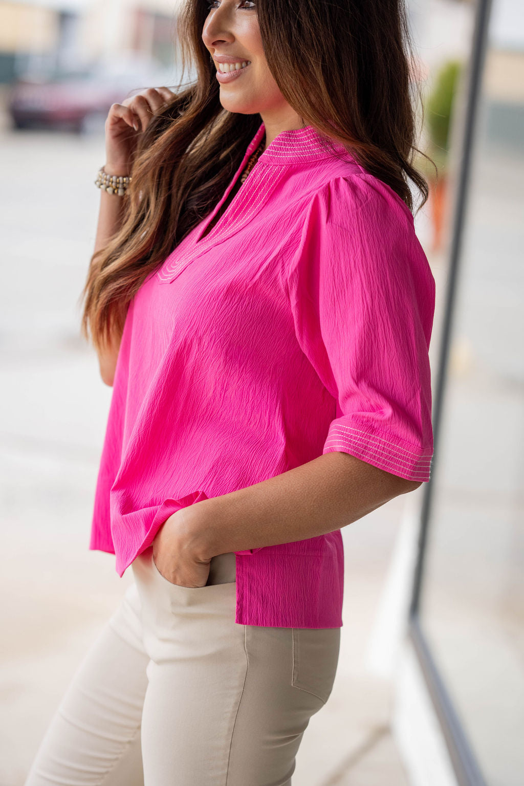 Clean, classic, and effortlessly polished—this embroidered-trim top is the perfect mix of elevated style and everyday ease. The notched neckline features contrast stitching for a subtle pop, while the half sleeves create a flattering, relaxed silhouette.