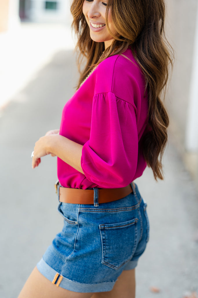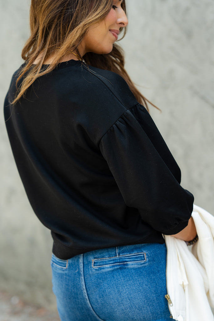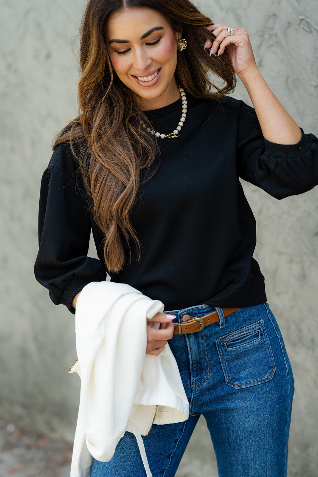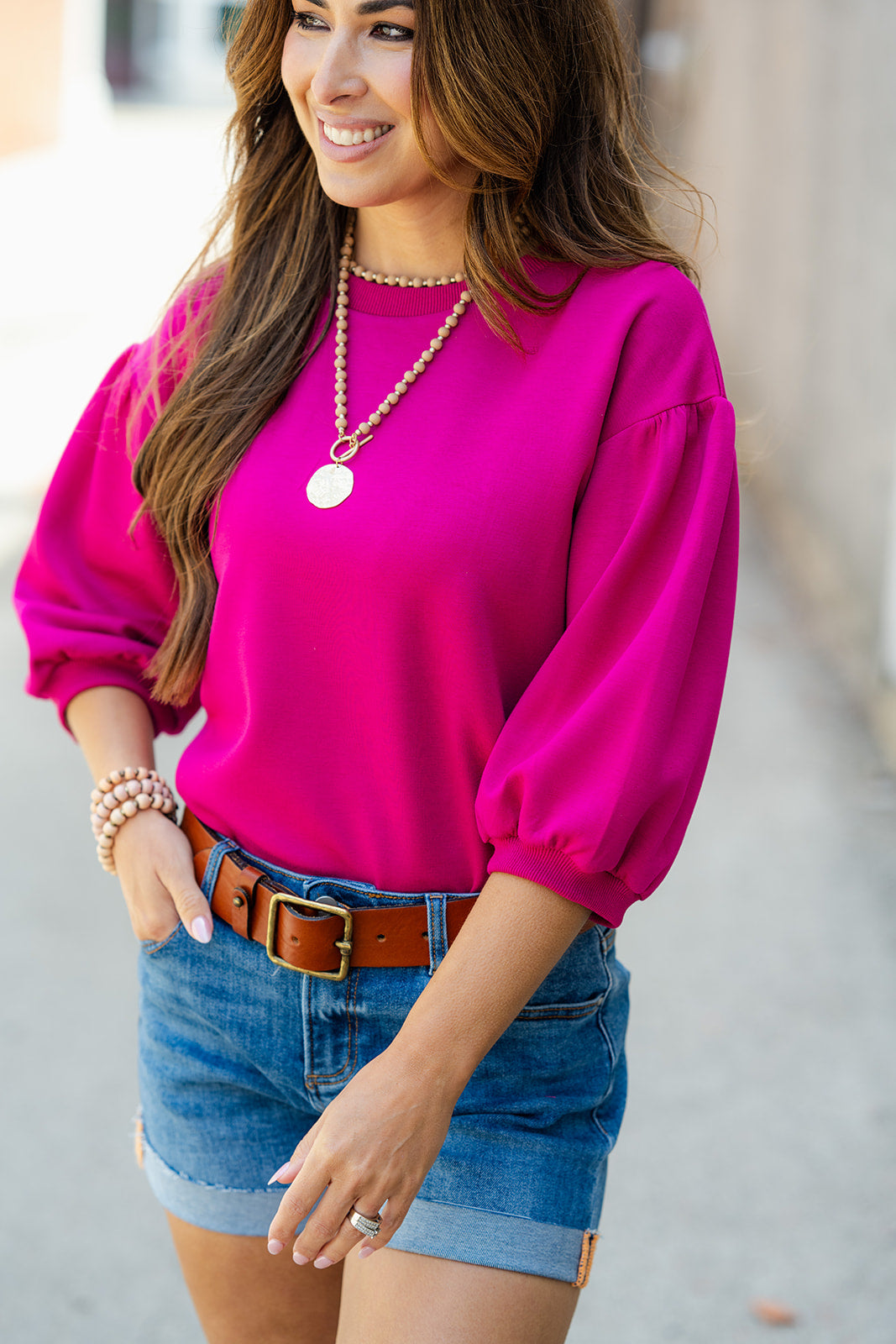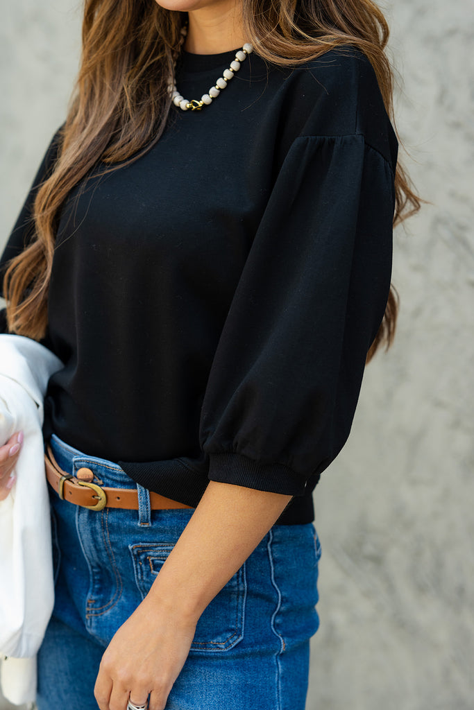 The feel of a sweatshirt with a more elevated look! This 3/4 sleeve top can be dressed up or down with ease for everyday wear! Pair with shorts or a skirt in the warmer months or layer with a blazer, cardigan, or jacket in the cooler ones!
