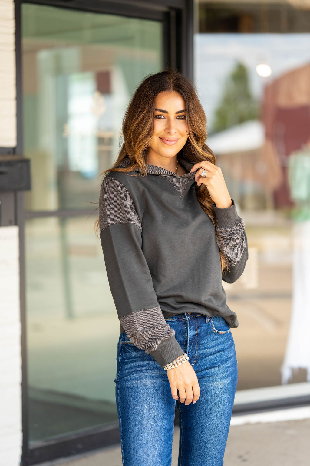 We're loving this lightweight hoodie! The heathered rib accents elevate it from your typical sweatshirt! Easily pair with your favorite denim or leggings for a quick and easy on-the-go look! The lightweight material makes it ideal to transition through seasons and it can easily be layered up for those colder days!