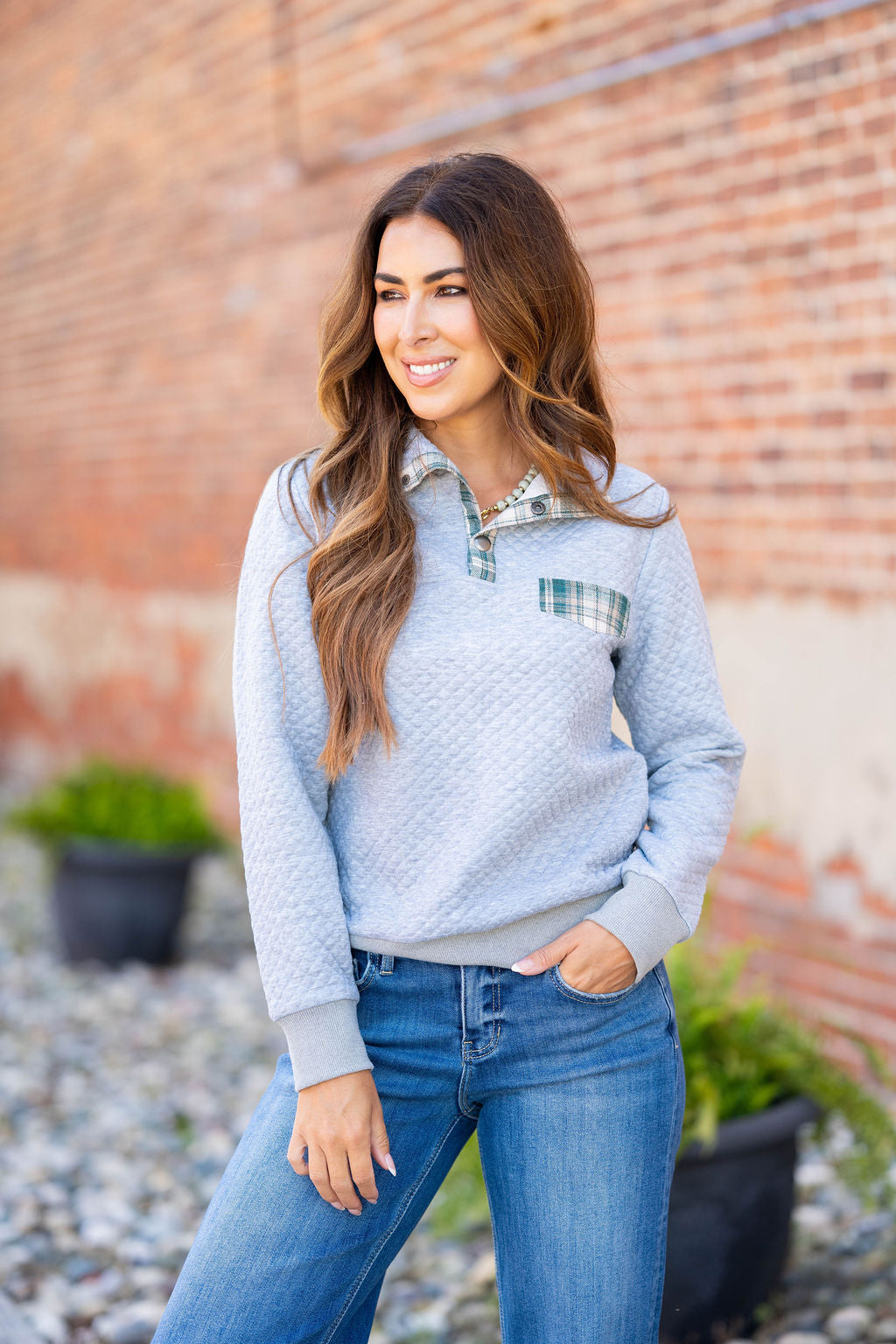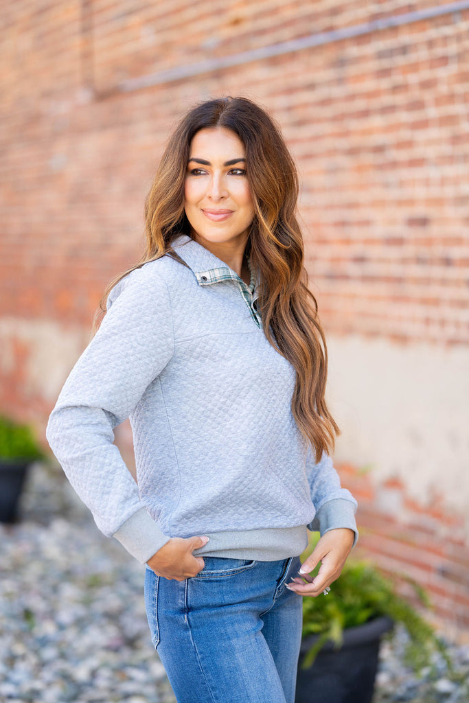 Your new go-to pullover has arrived! Soft and lightweight, this can be worn with shorts in the warmer months or leggings, denim, or joggers in the cooler ones! We love that this can take you from the gym to busy days on-the-go! The quilted texture and plaid accents really make this one-of-a-kind!