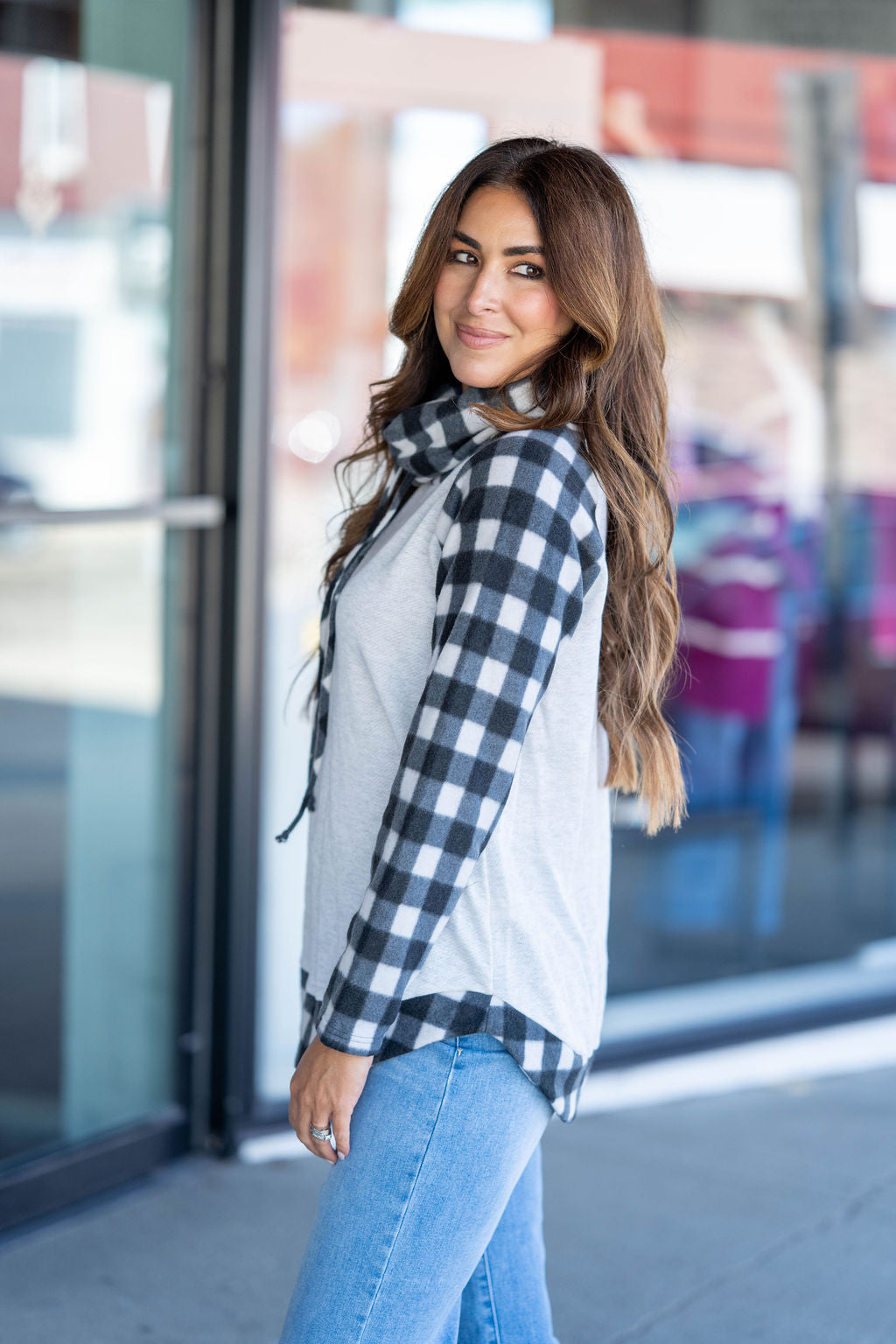 Plaid Trimmed Cowl Neck Sweatshirt
