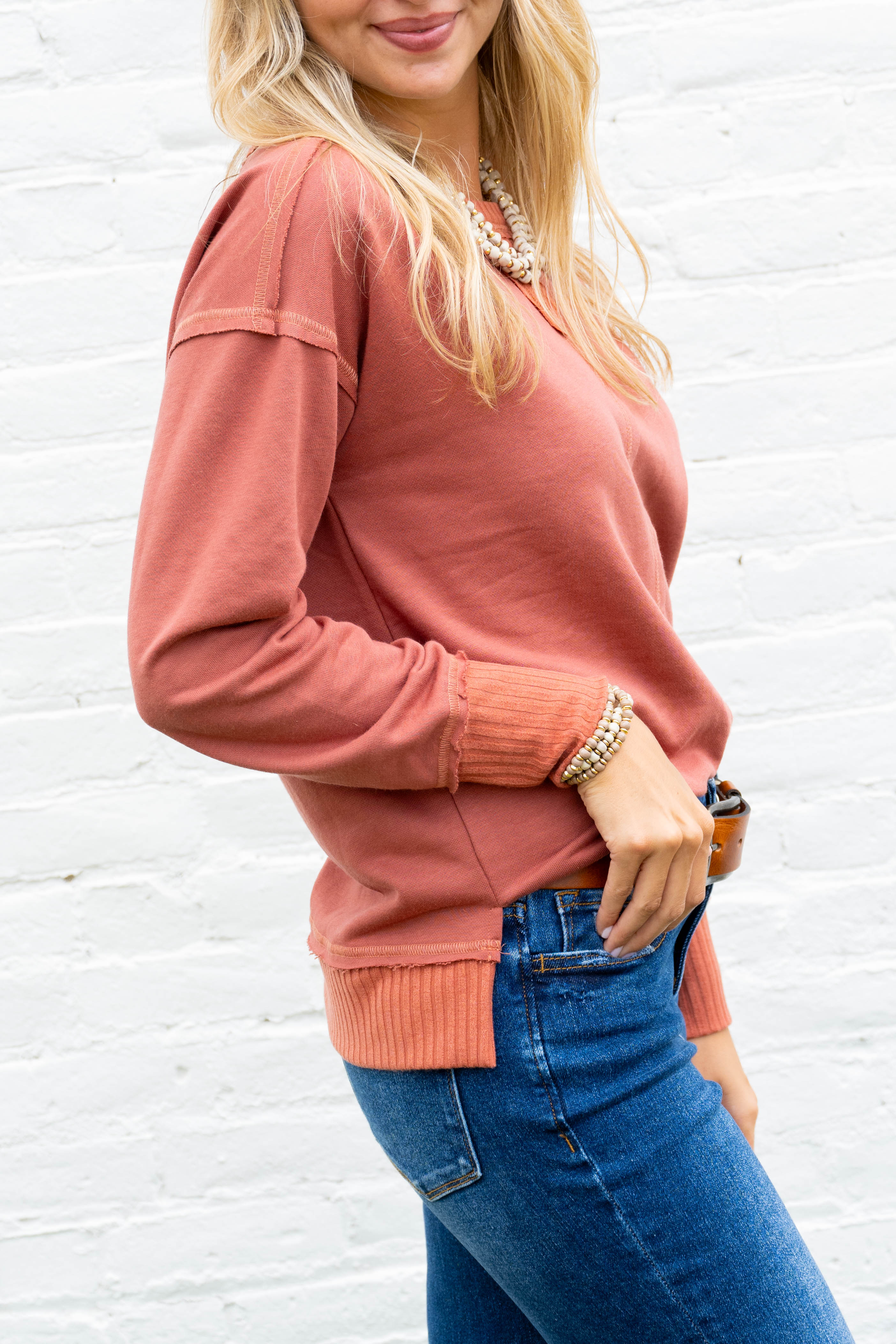 Crewnecks are an absolute staple piece! This sweatshirt is soft and lightweight and features a ribbed trim and bold raw seam detailing to add that extra pizzaz! Pair with shorts in the warmer months or with denim, joggers, or our Betsey's Jeggings in the cooler ones! Chilly? Simply add a vest or jacket!