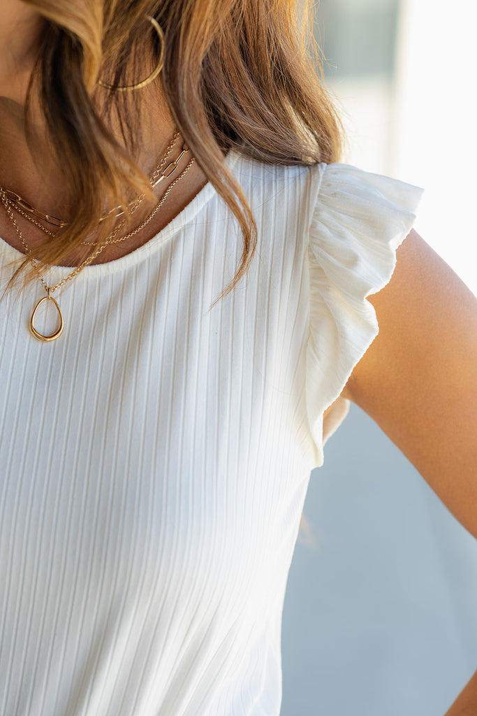 A soft and lightweight tank elevated with wide ribbed detailing and a flutter trim! This tank can be worn alone in the warmer months with shorts or a skirt or used as a layering piece for all of your cardigans or shackets in the cooler ones!