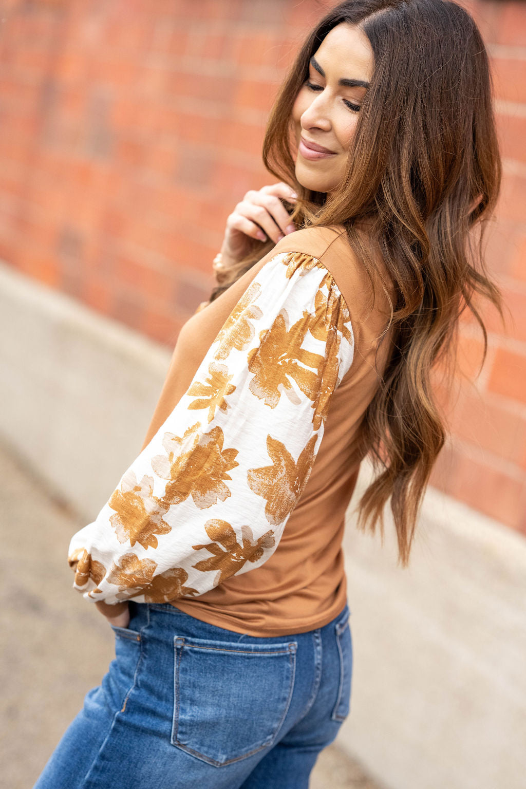 This top is the perfect blend of cozy and charming. Featuring a soft solid body paired with contrast floral long sleeves, it adds just the right amount of detail while staying easy to wear.
