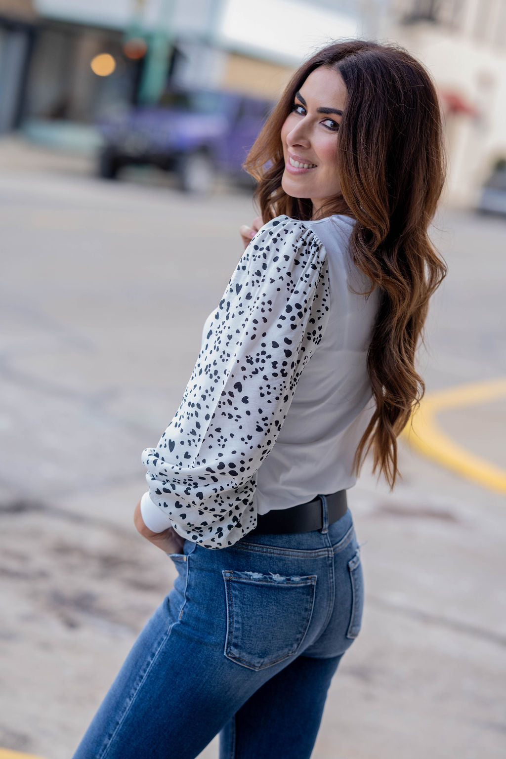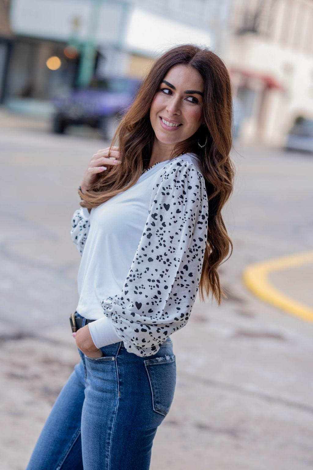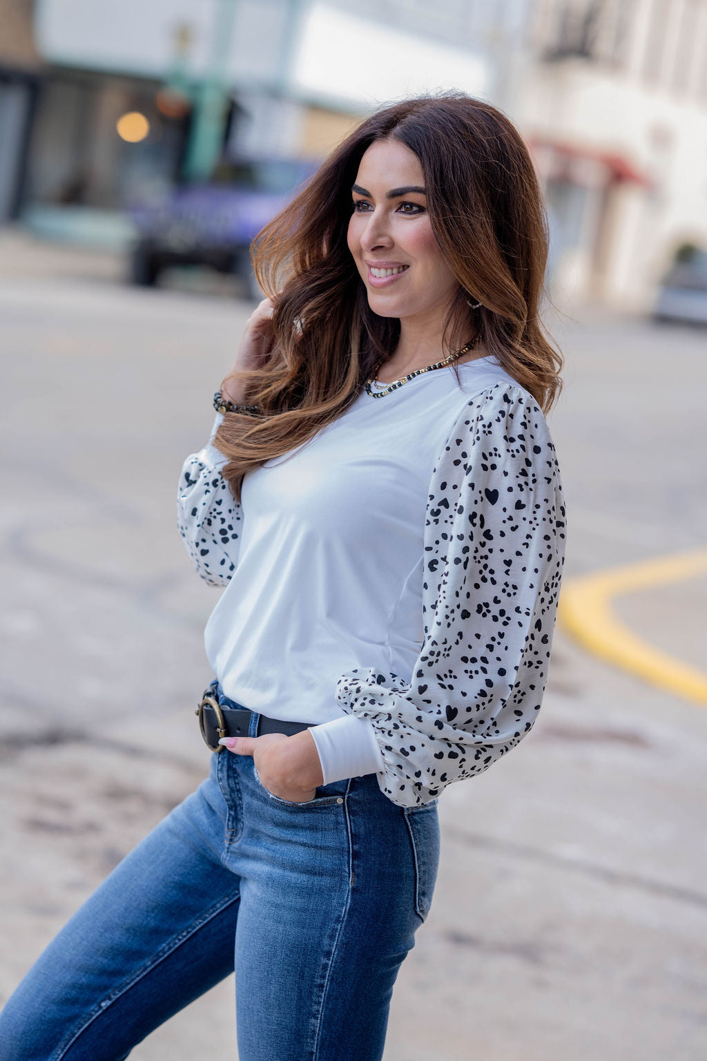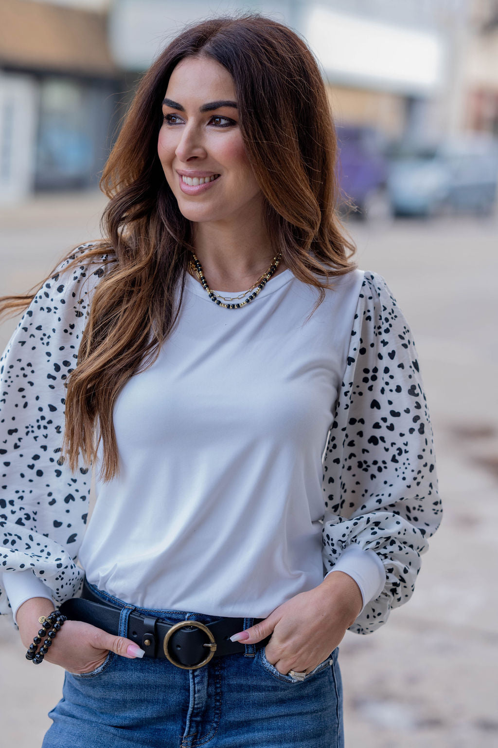 Make a subtle statement with this soft knit top featuring bold, spotted balloon sleeves. The contrast between the smooth body and the airy, printed sleeves creates a polished-yet-playful look you can dress up or keep casual.