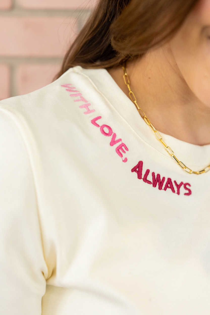 This everyday tee features a classic, flattering fit with a subtle embroidered message along the neckline for a thoughtful touch. Made from a soft, comfortable fabric, it’s perfect for wearing solo or layering under your favorite jackets and cardigans.