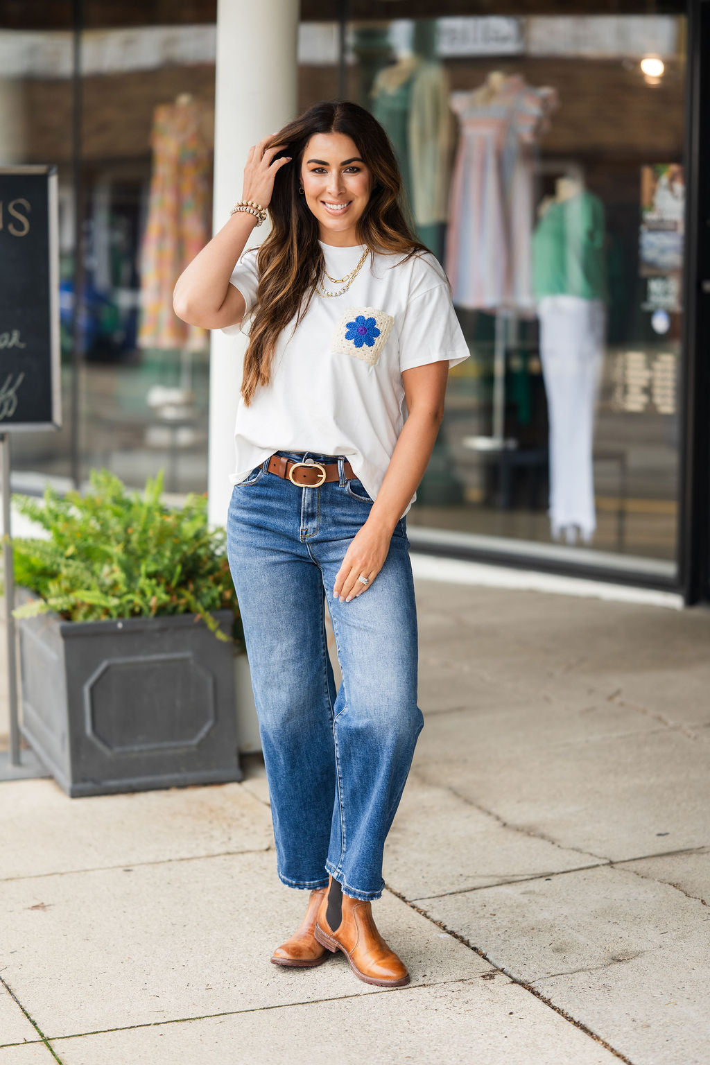 A simple short sleeve tee with a relaxed fit and a fun crochet accent to set it apart from the rest! Pair with shorts or tucked into a skirt in the warmer months or add a cardigan or jacket in the cooler ones!