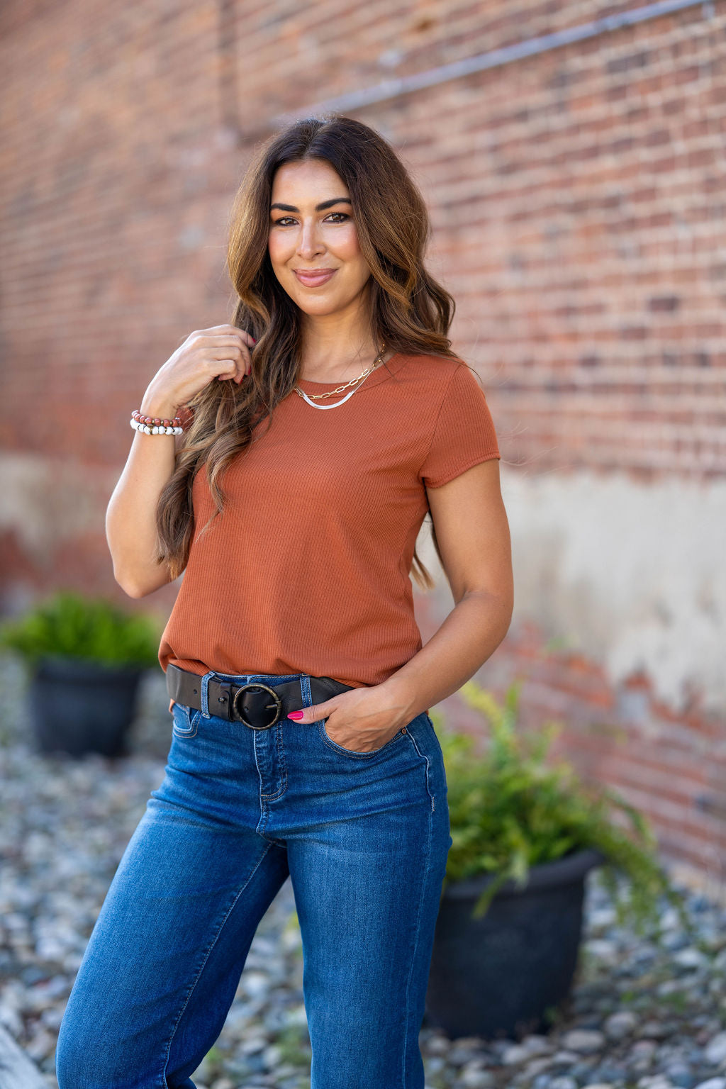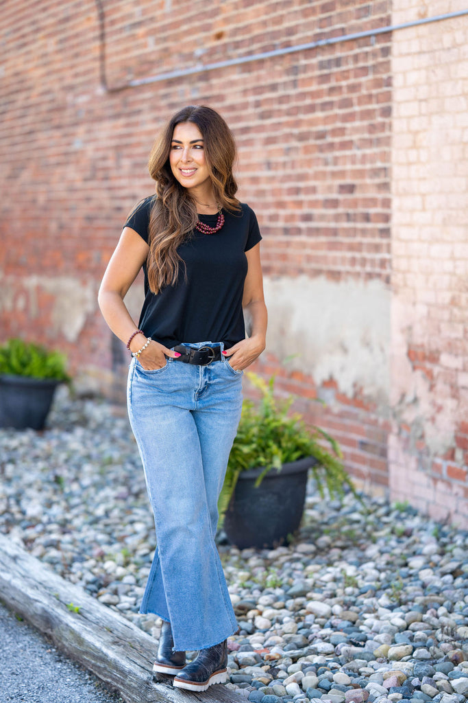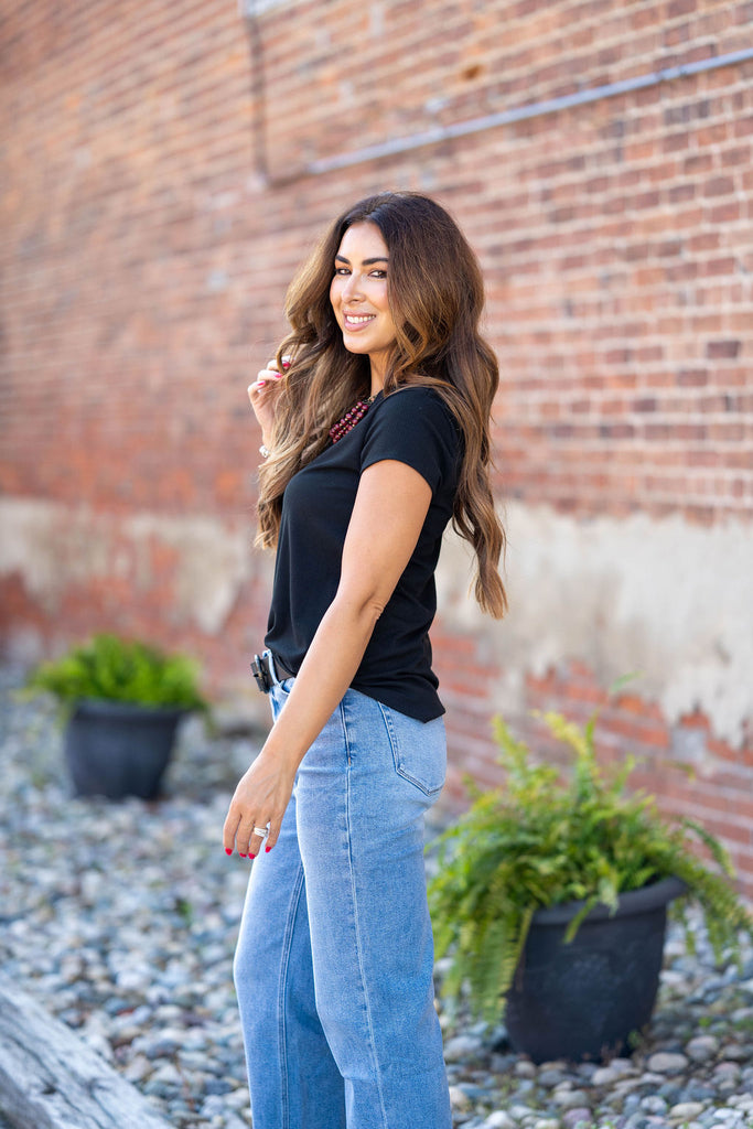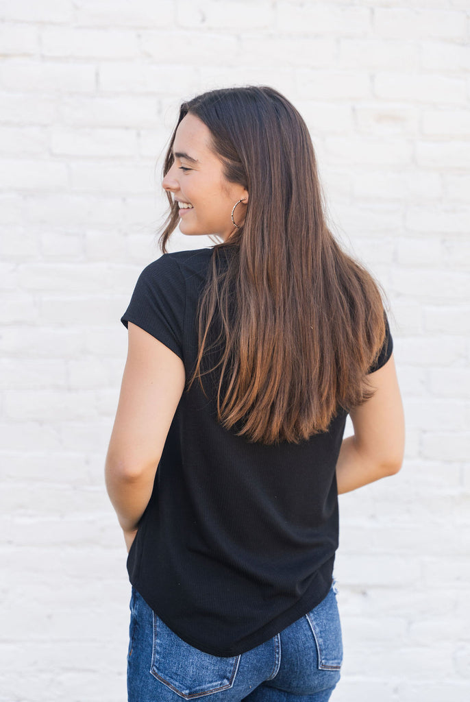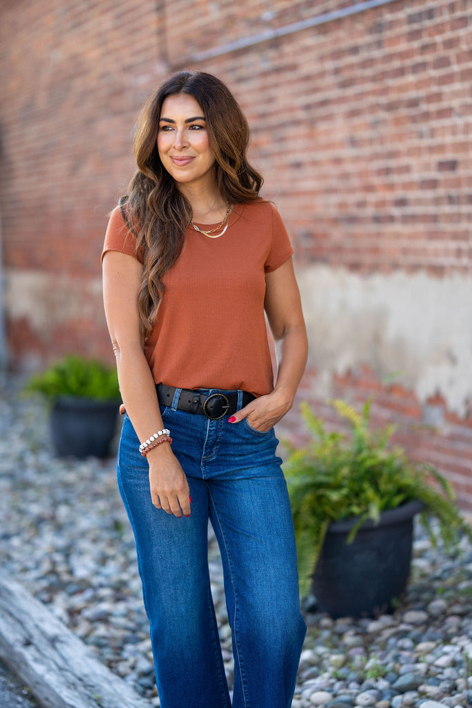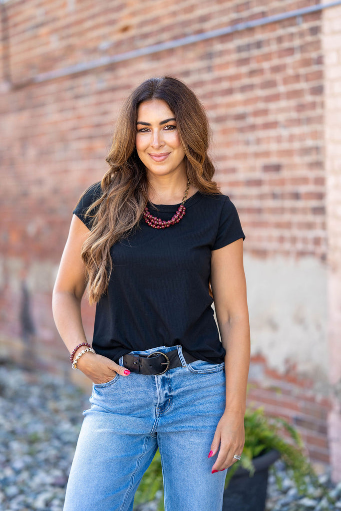 A basic soft short-sleeve tee with a ribbed texture! We love how this tee can be dressed up or down for any occasion and carried through every season with its ease of layering! This is definitely a staple piece to add to your wardrobe!