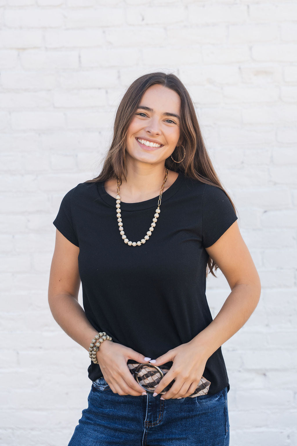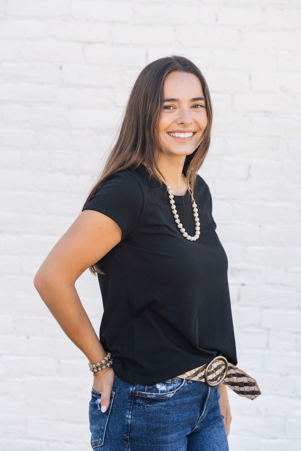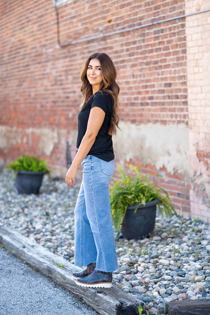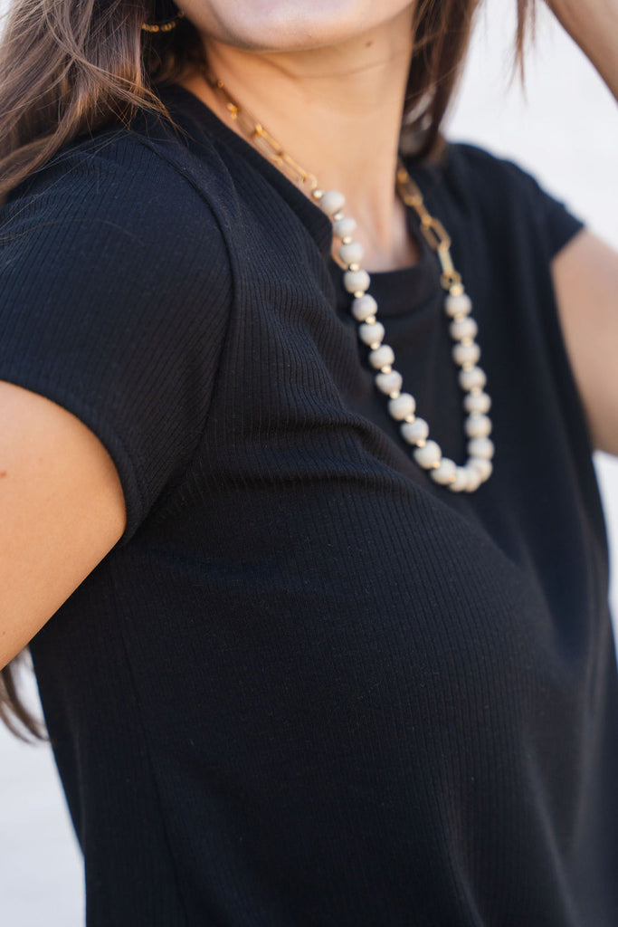 A basic soft short-sleeve tee with a ribbed texture! We love how this tee can be dressed up or down for any occasion and carried through every season with its ease of layering! This is definitely a staple piece to add to your wardrobe!
