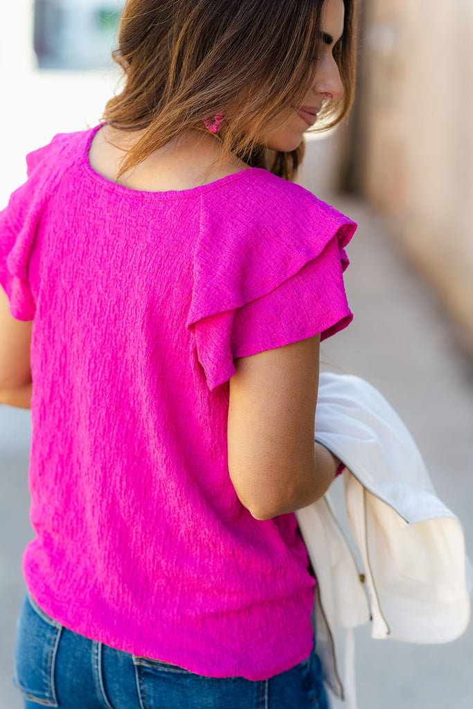 A basic tee taken to the next level with the cute and classy double flutter sleeves and a subtle texture! Pair this with a cute pair of high-waisted shorts or a skirt for the warmer months or use it as a layering piece with a cardigan or shacket for the cooler ones!