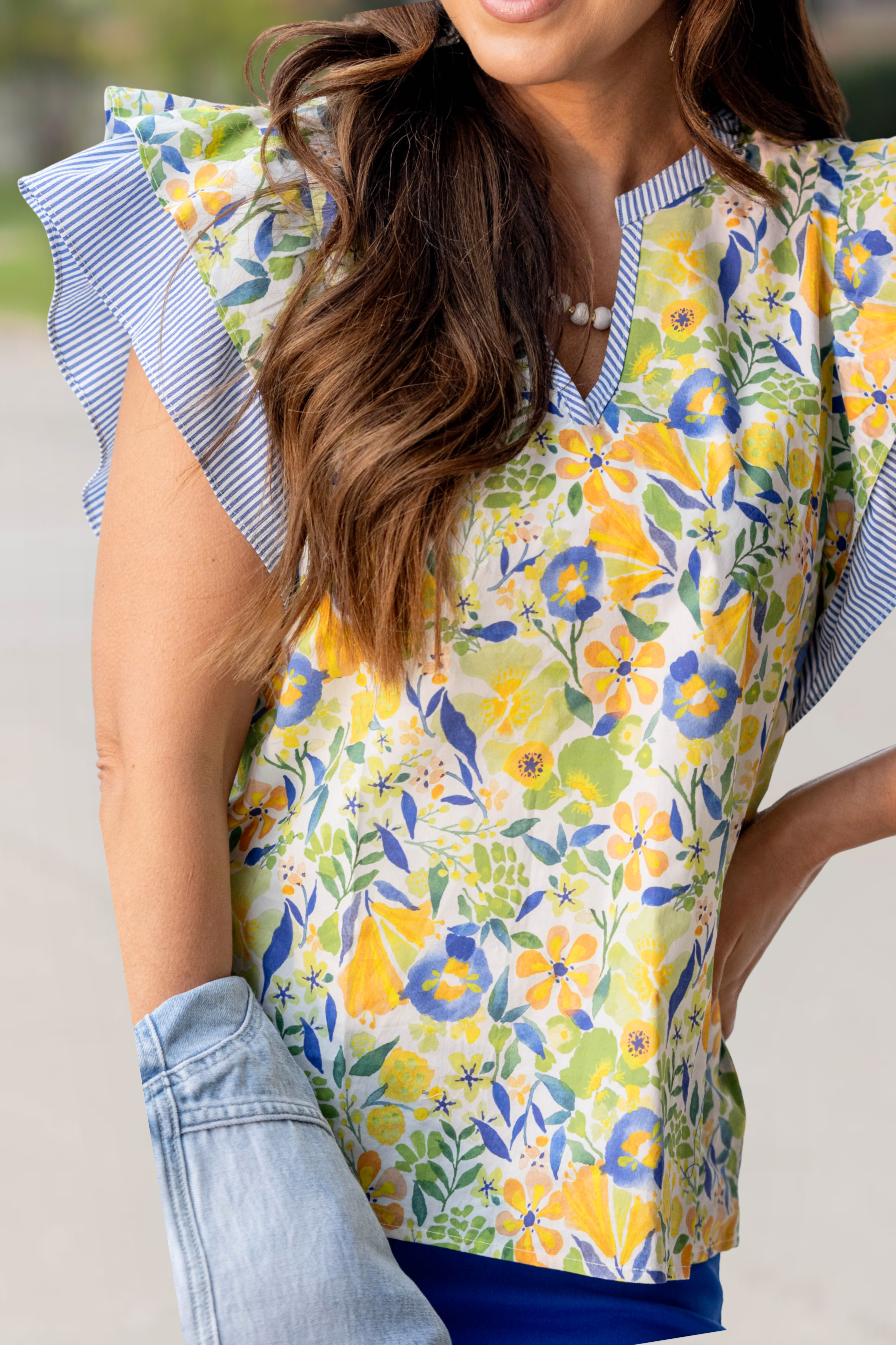 A cheerful floral moment with the prettiest movement. This woven blouse features a soft floral print contrasted by crisp striped ruffle sleeves for a playful, elevated twist.