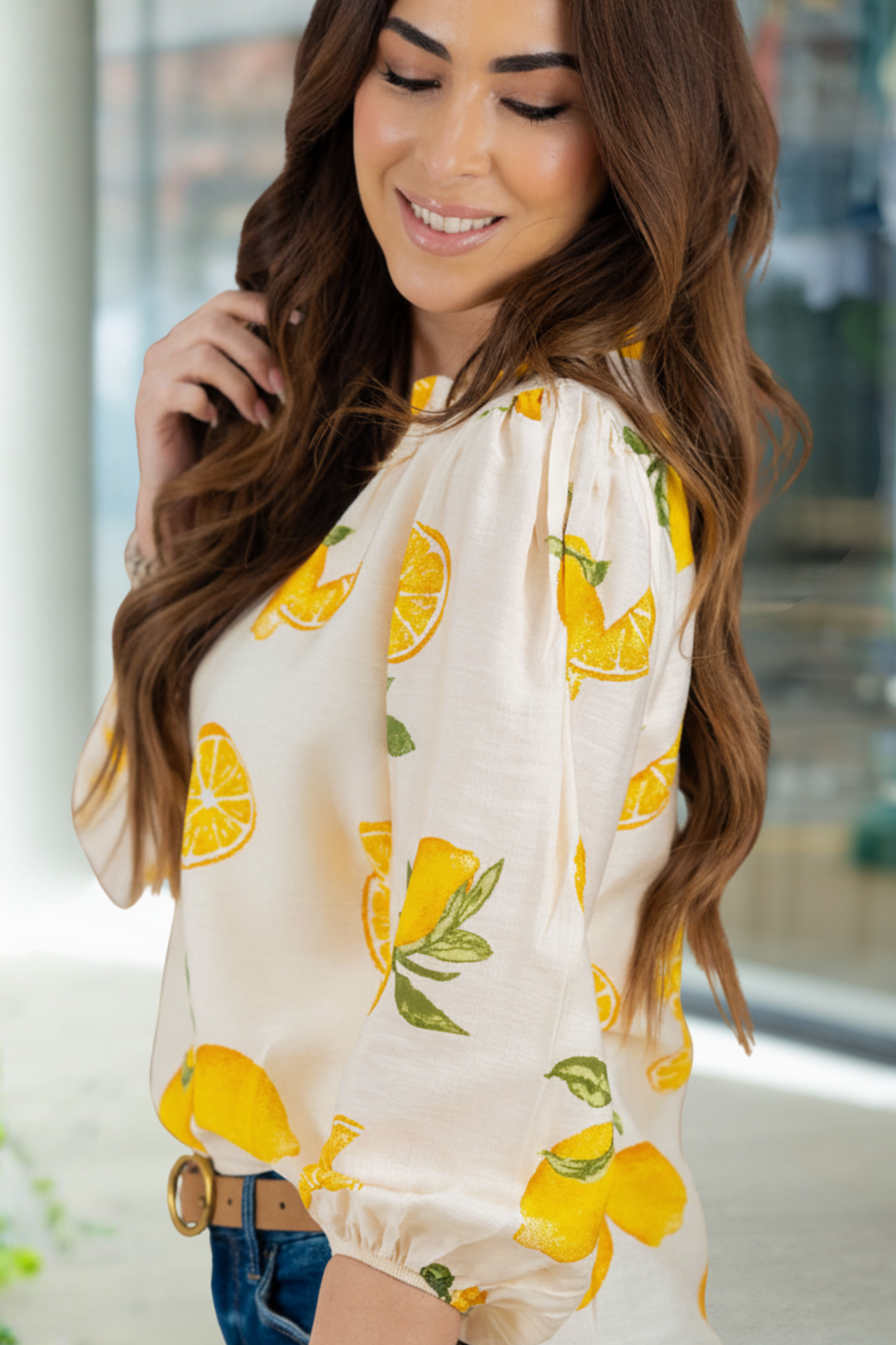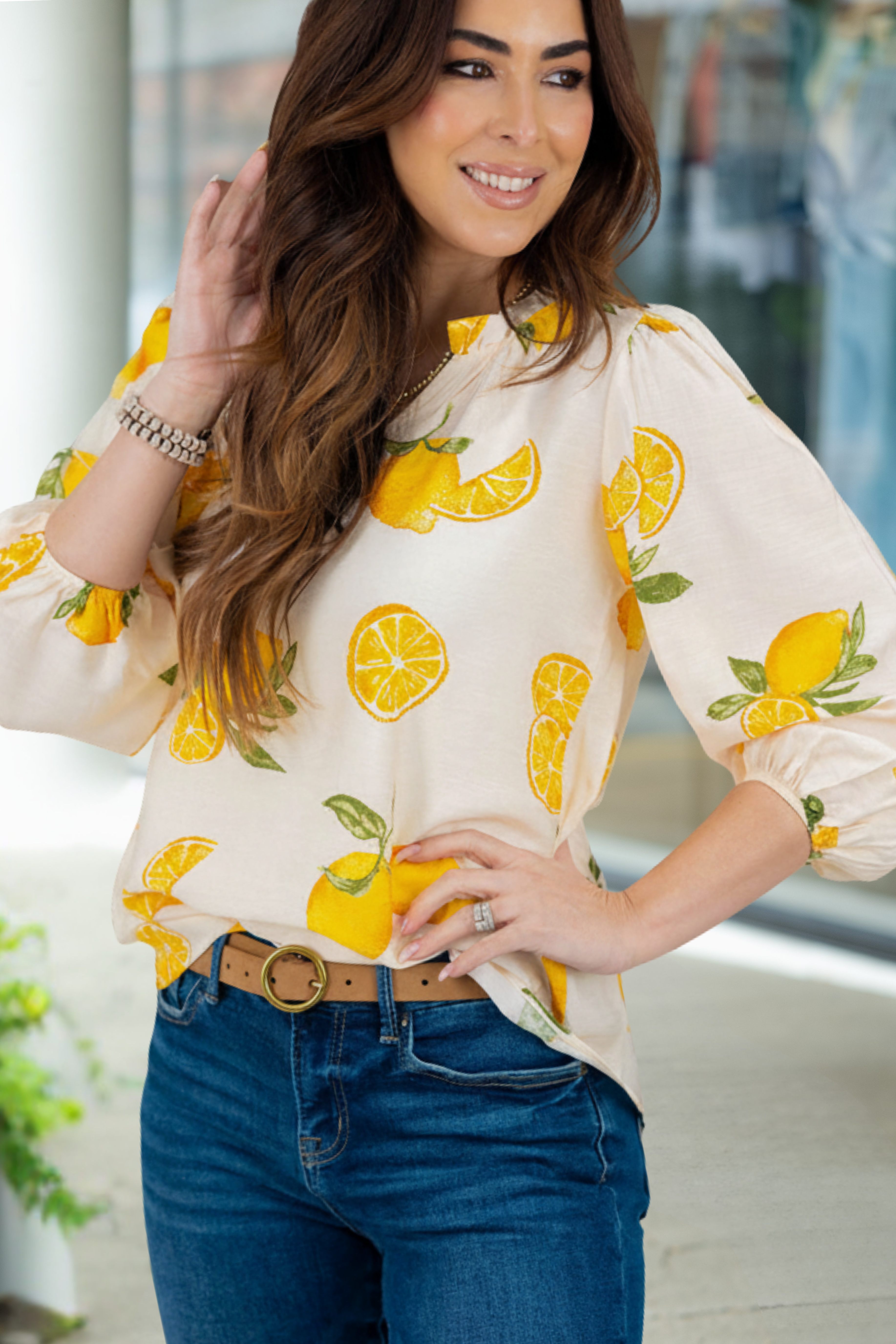 Bring a little sunshine to your wardrobe with this playful lemon-print blouse. Light, airy, and effortlessly cheerful, it features a soft v-neckline, gentle gathers, and breezy sleeves for an easy, flattering fit.