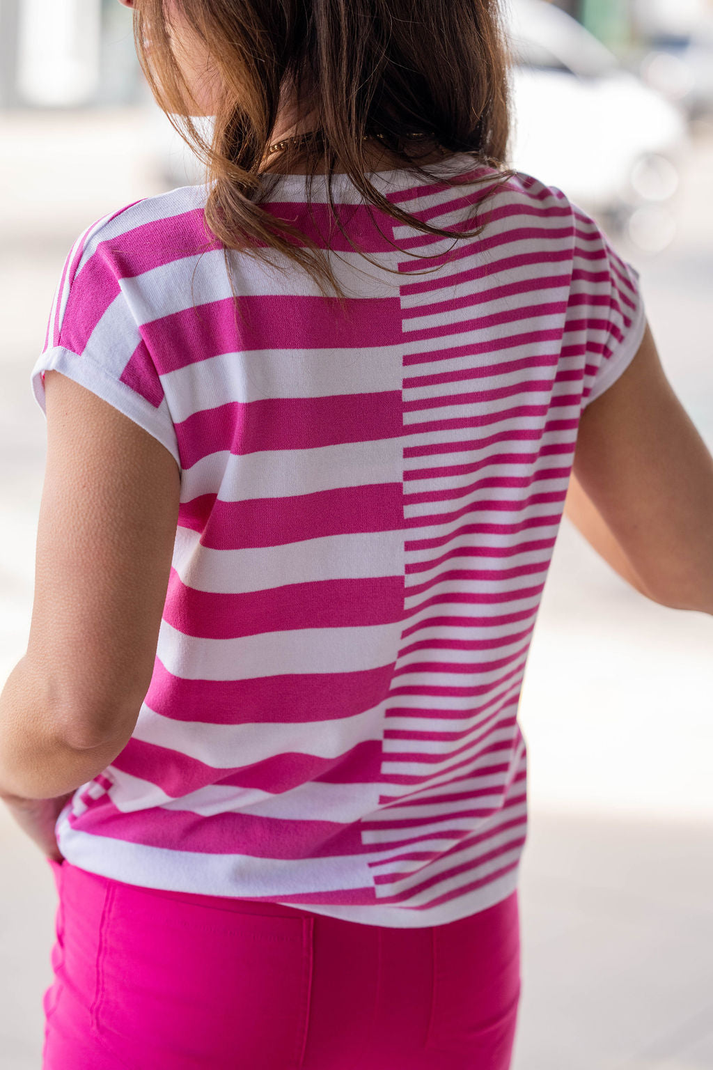 Make a statement with the Mix It Up Striped Knit Tee - where classic stripes meet a modern, eye-catching twist. Designed with a unique mix of stripe directions and widths, this top brings playful energy to an everyday essential. The lightweight fabric and relaxed fit keep it comfortable and easy to wear, while the cap sleeves add a flattering, laid-back touch.