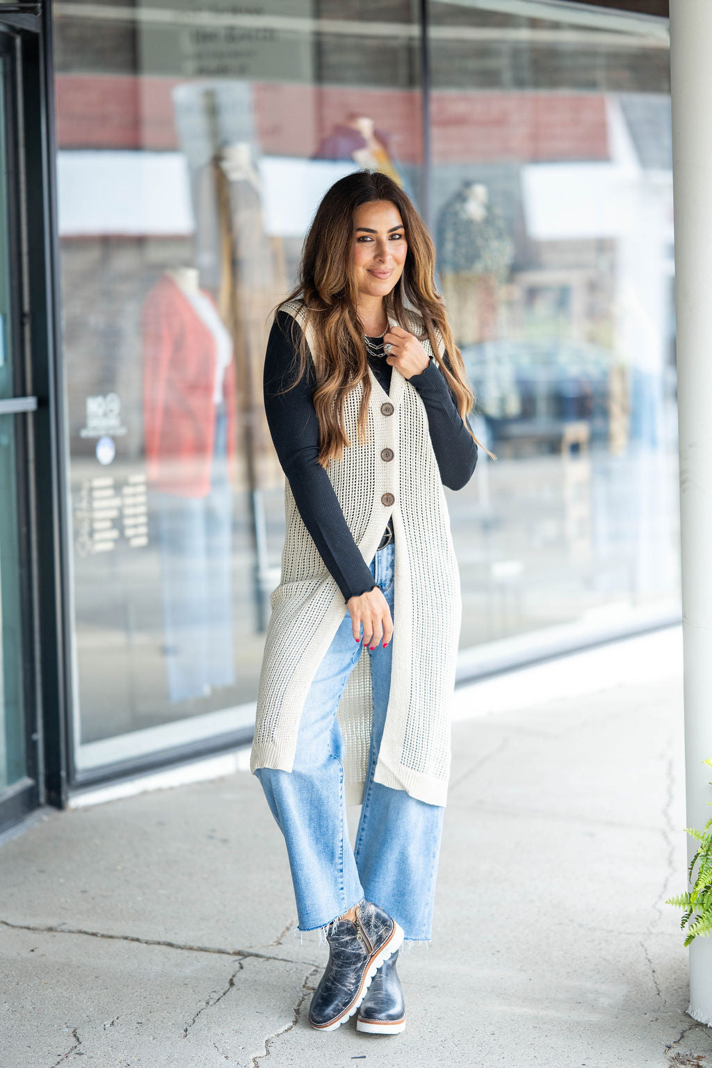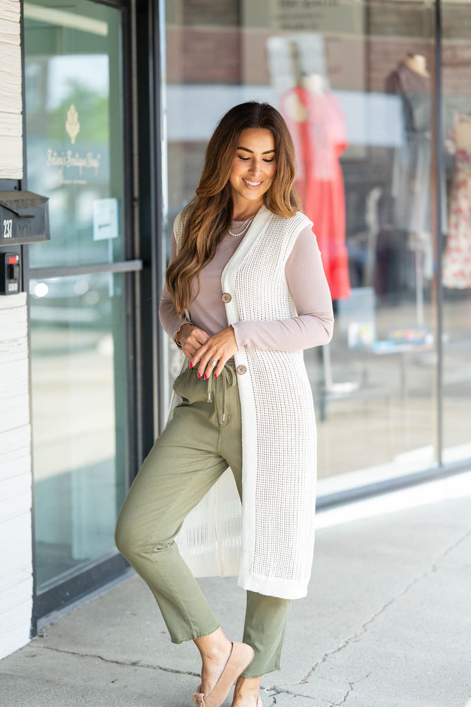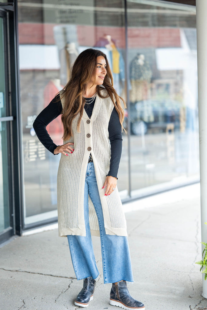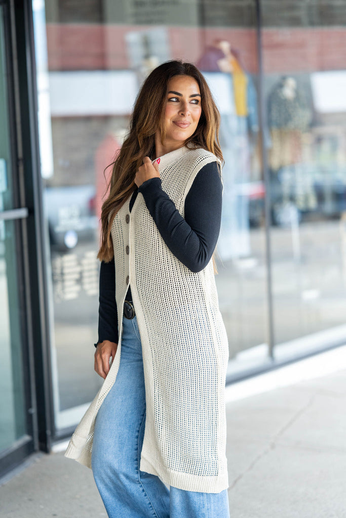 Layer up with this lightweight tunic-length vest! The open weave look and button accents will compliment your outfit beautifully! The length of this vest is perfect to wear with leggings or over a blouse and skirt, a dress, or really whatever! With the lightweight and breathable material of this, you will be able to wear it all year round!