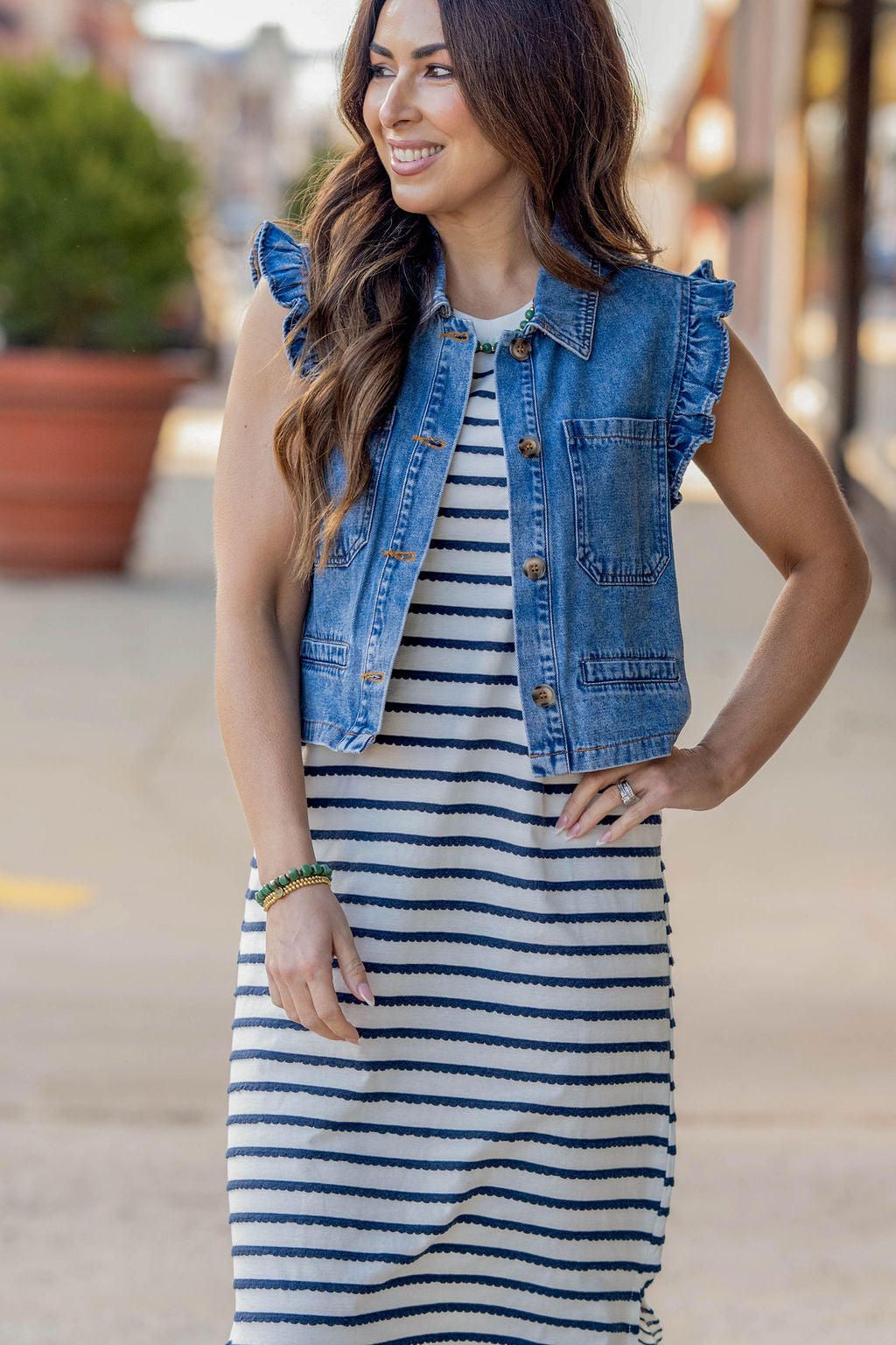 Add a touch of warmth and style to any look with this vest! The ruffle trim really POPS and we love how it's elevated with the pockets! Throw this on over a dress, blouse, basic or graphic tee, anything!