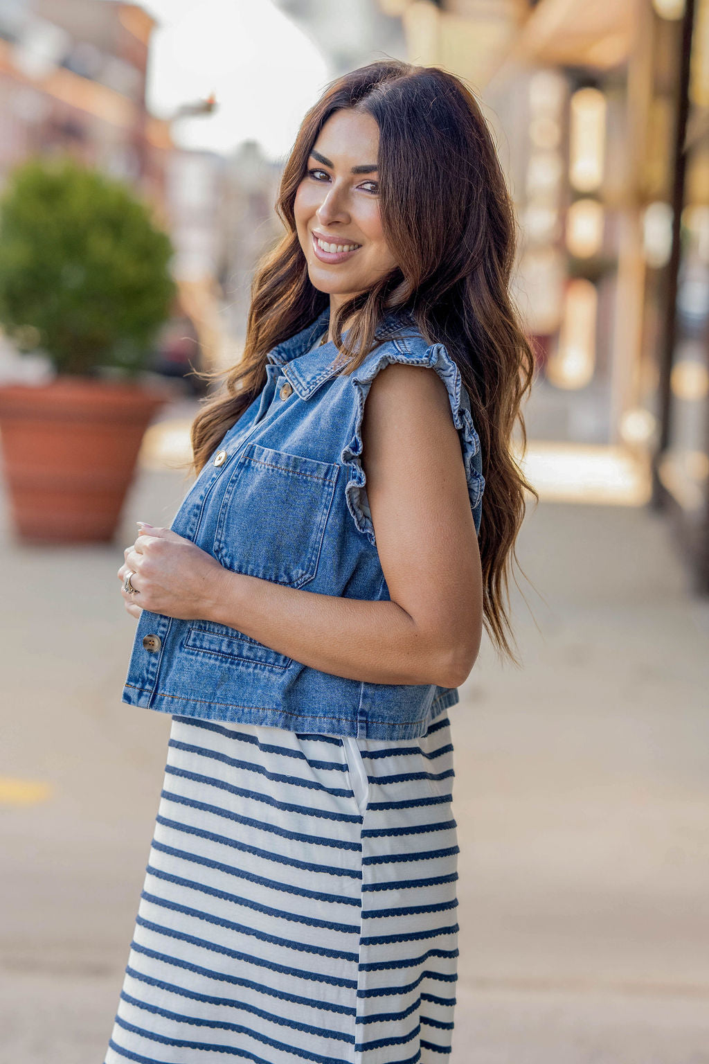 Ruffle Trim Pocket Denim Vest