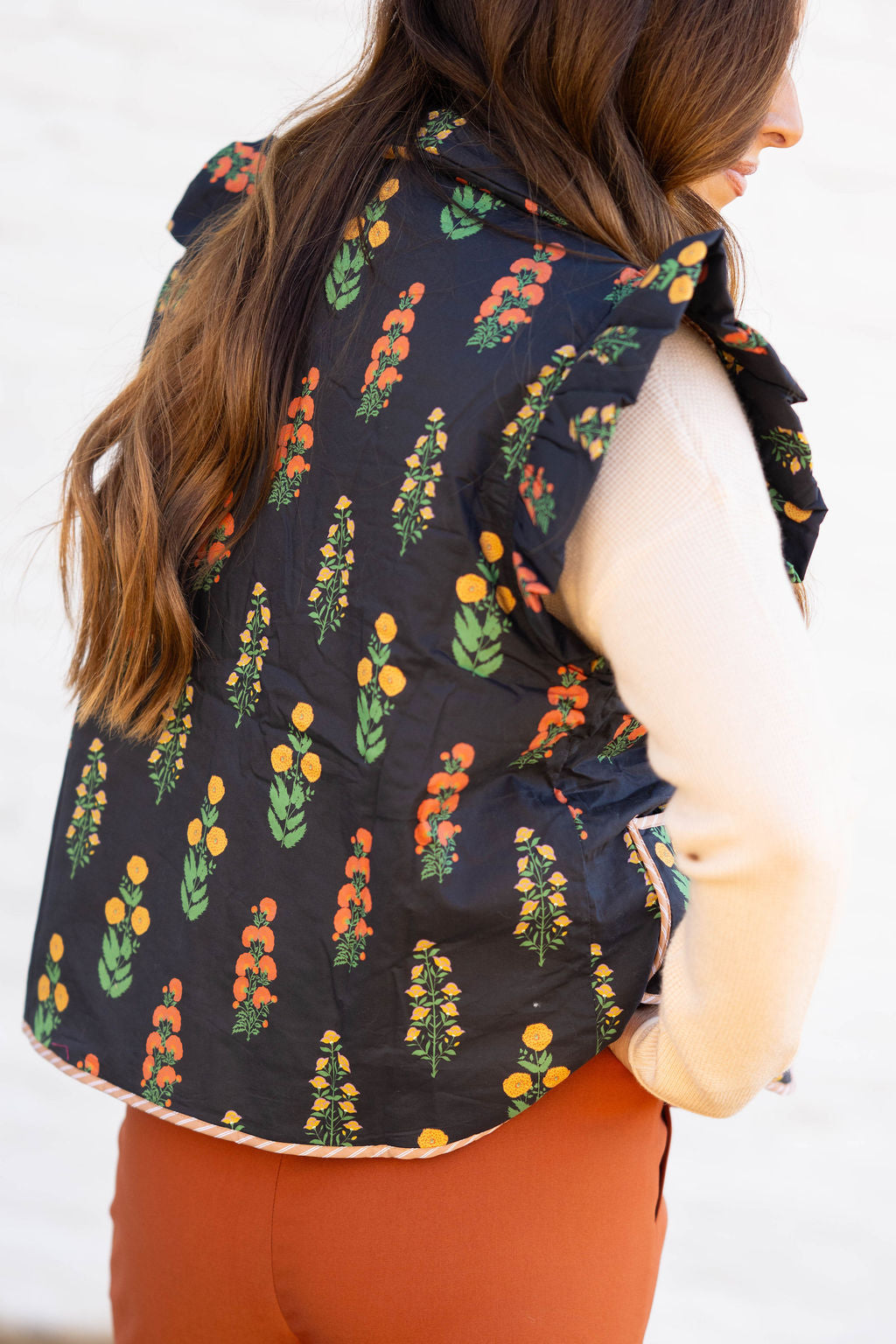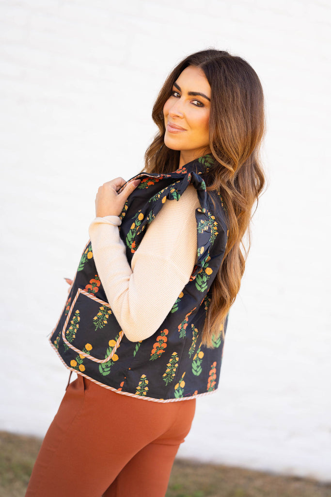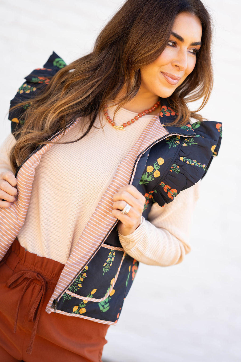 A playful take on fall layering, this floral vest brings charm and warmth to every outfit. Its quilted texture and ruffle shoulders add a feminine twist to classic outerwear.