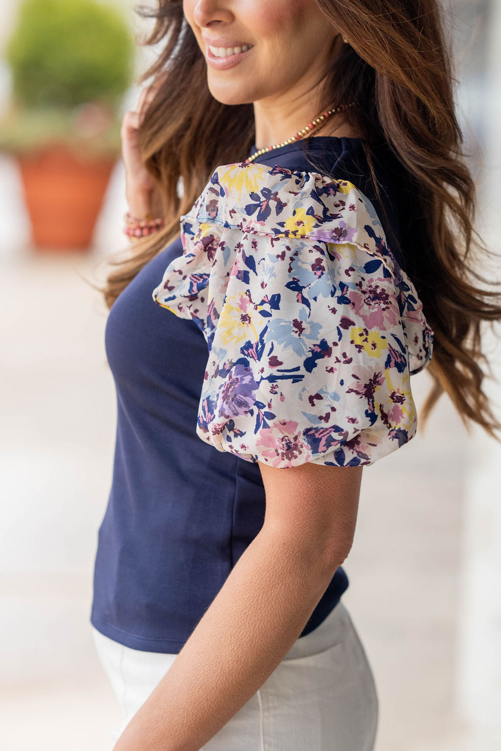 Feminine charm meets everyday comfort in this effortlessly stylish top. Featuring a soft, fitted knit bodice paired with delicate sheer sleeves adorned in a romantic floral print, this piece brings the perfect balance of classic and playful.