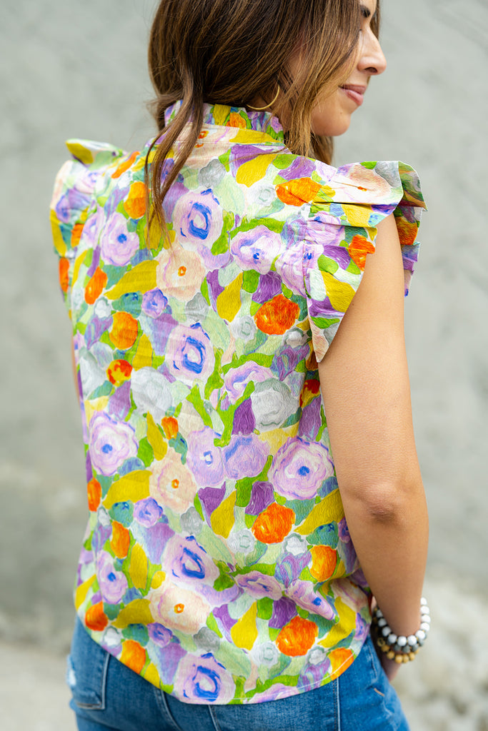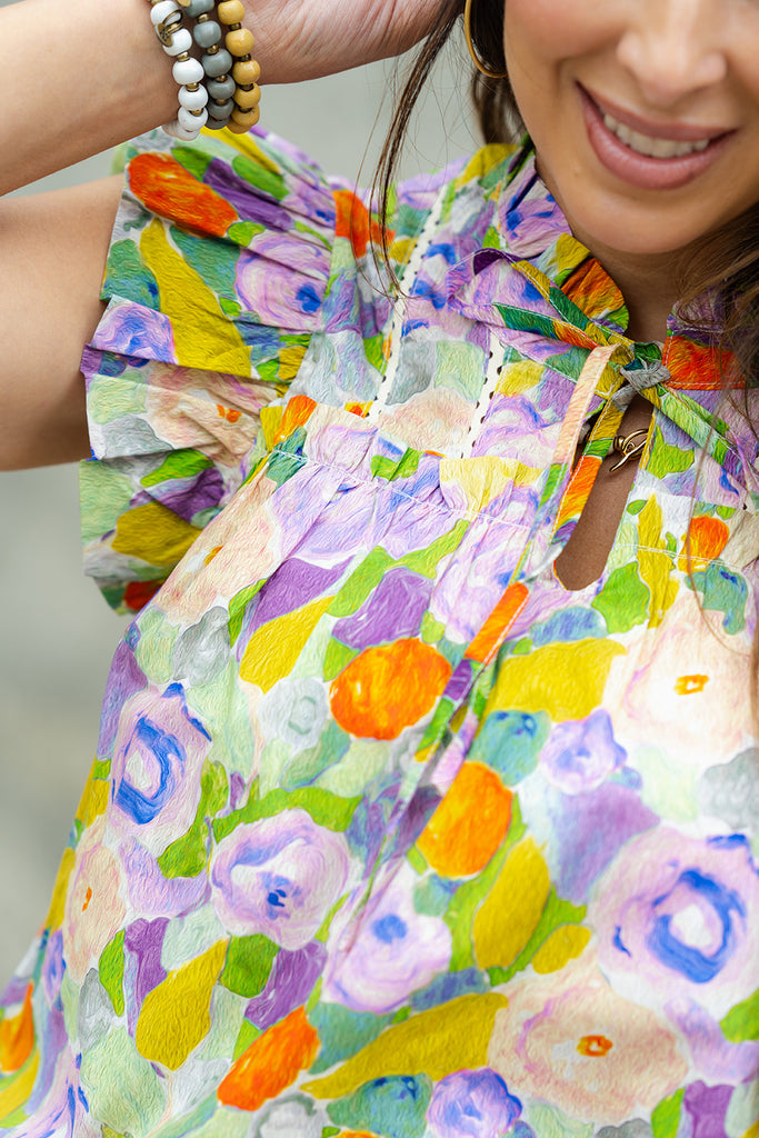 The painted floral pattern of this tank with the fun flutter trim really sets it apart from the rest! We love that you can pair this with shorts or a skirt in the warmer months or with a pair of denim and a cardigan for the cooler ones!