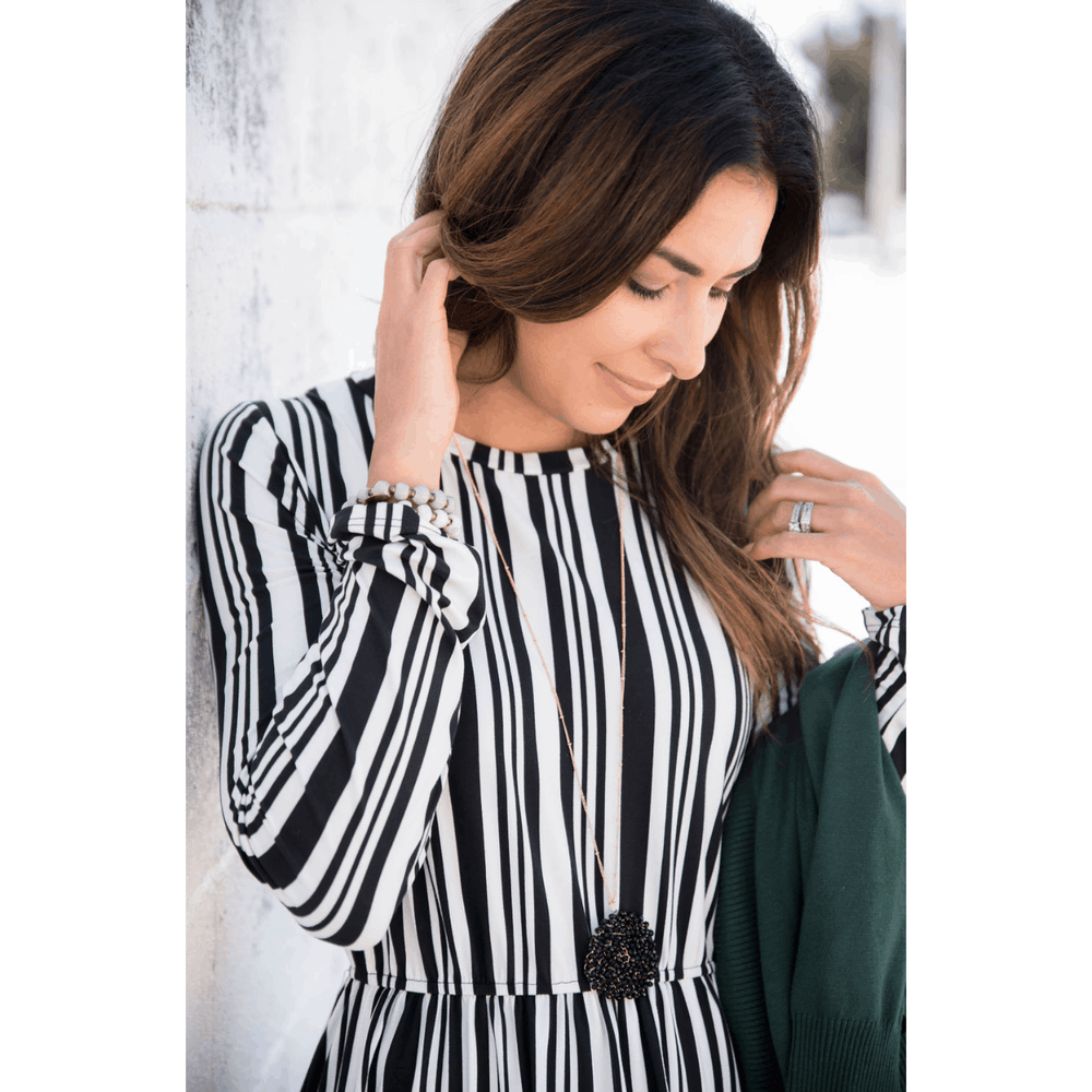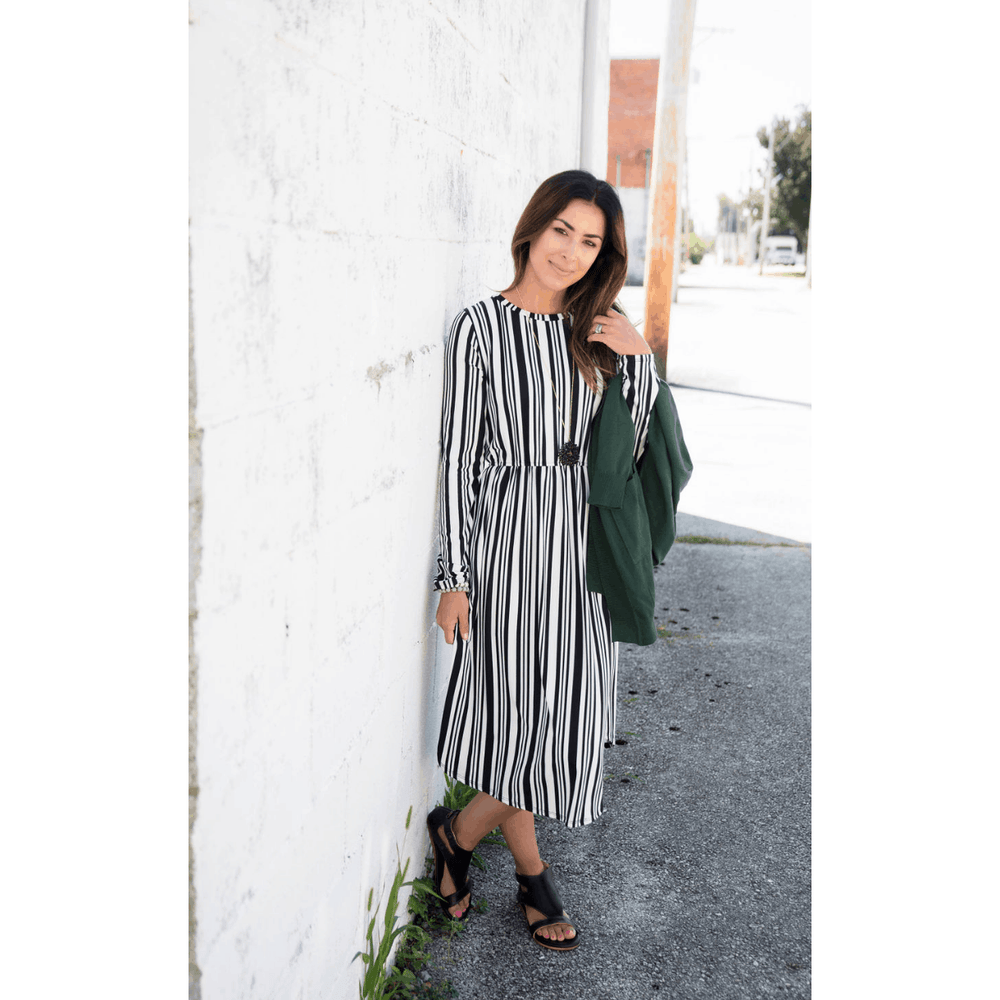 Vertical stripes have a super slimming effect and the cinched waist gives the perfect hourglass shape! This dress is made of super stretchy and lightweight material, making it ideal for any season!