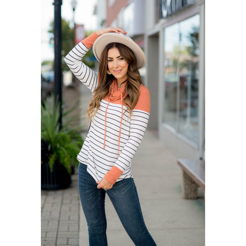 This long sleeve cowl neck is so cute! You will love the stripes and the solid shoulder and cuff details of this sweatshirt so much, you will want to wear it all the time! Wear it with jeggings or jeans!