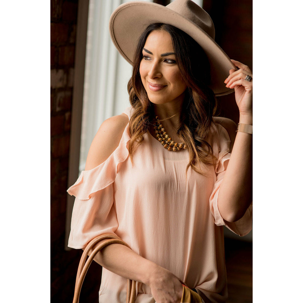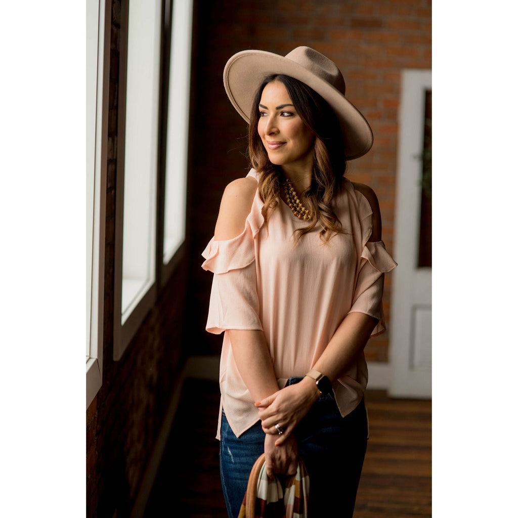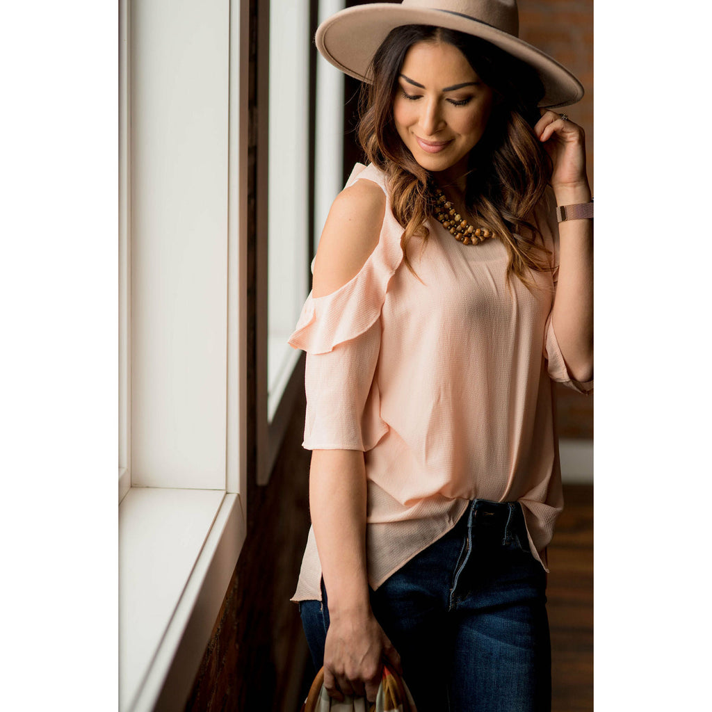 This cold shoulder blouse can be worn in every season, with its lightweight material! Throw a denim jacket or cardigan over it when it gets chillier or wears it alone and let it speak for itself. The ruffle detailing along the sleeve is the perfect touch to this blouse! It looks great paired with white pants or colored jeggings for a pop of color. You can even add a statement pair of earrings to tie the whole outfit together. This blouse is so simple and can easily be styled in any way to fit your personality!