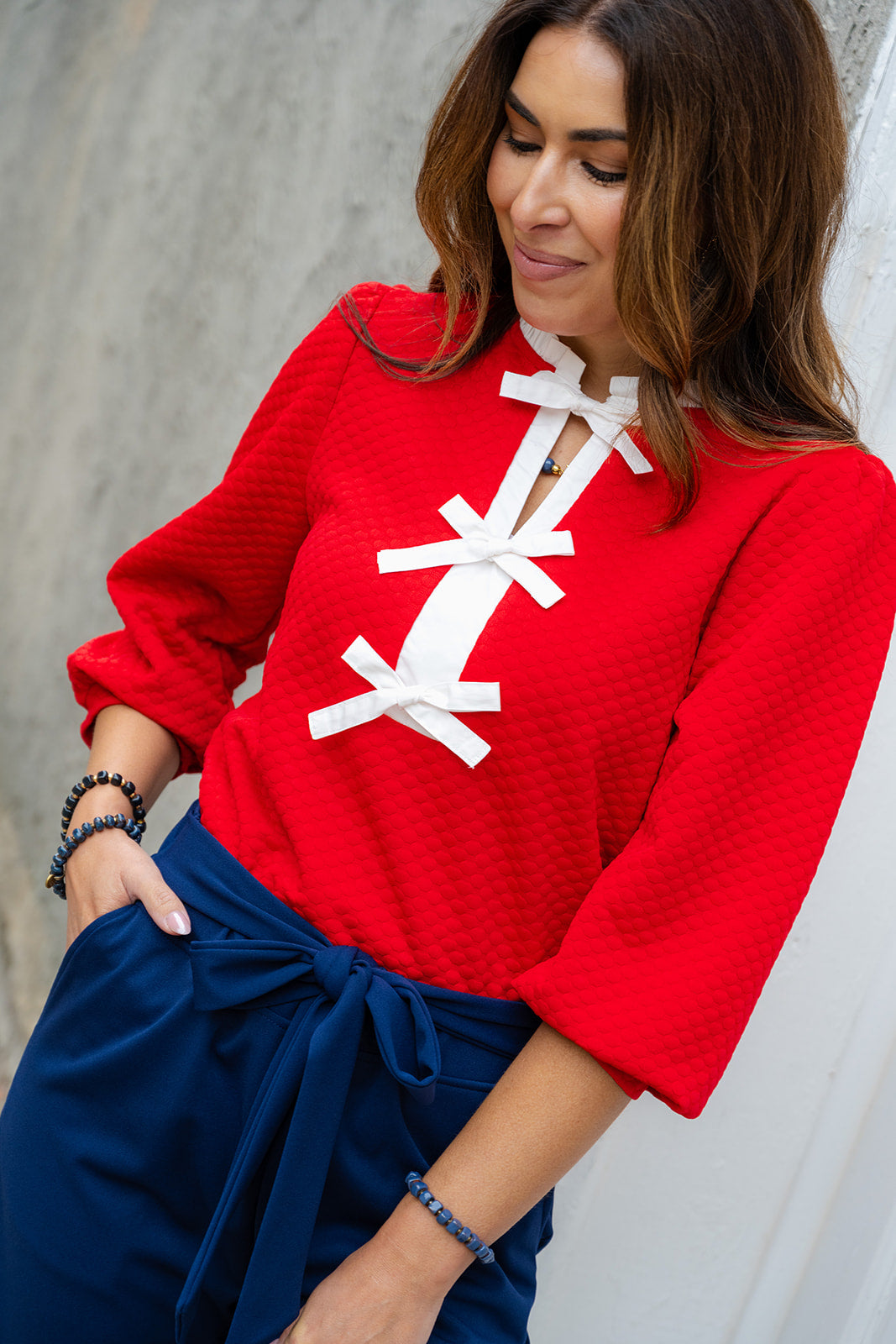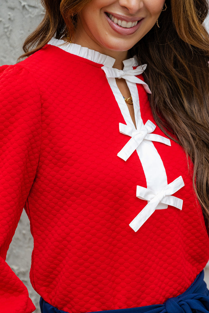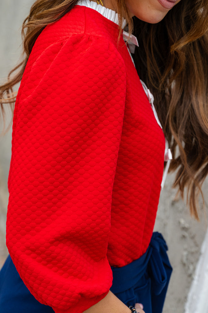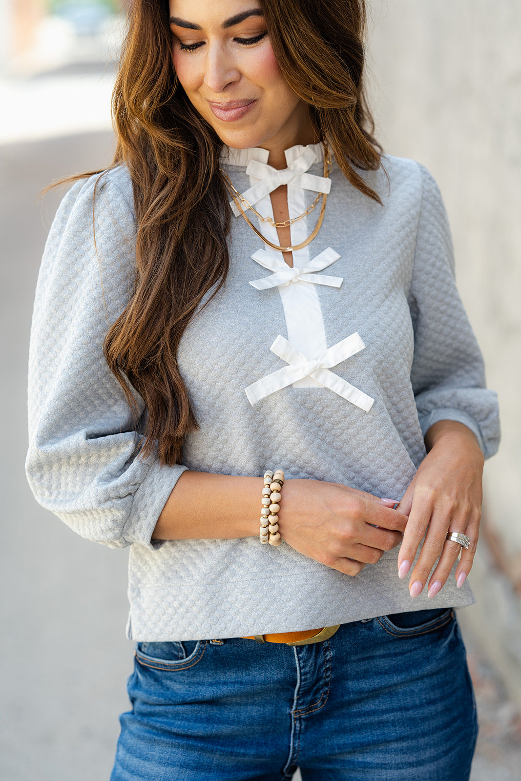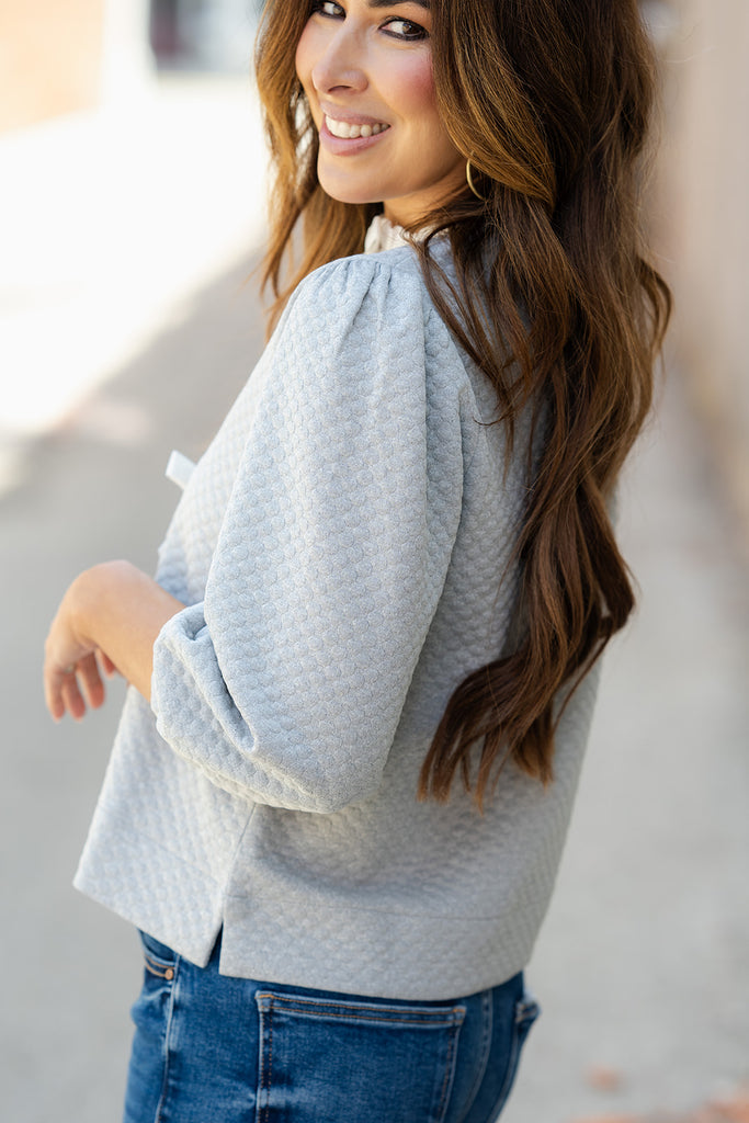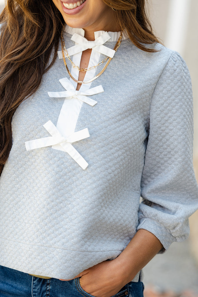 Bow Accented Bold Textured 3/4 Sleeve Sweatshirt