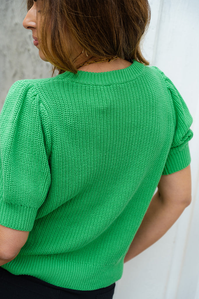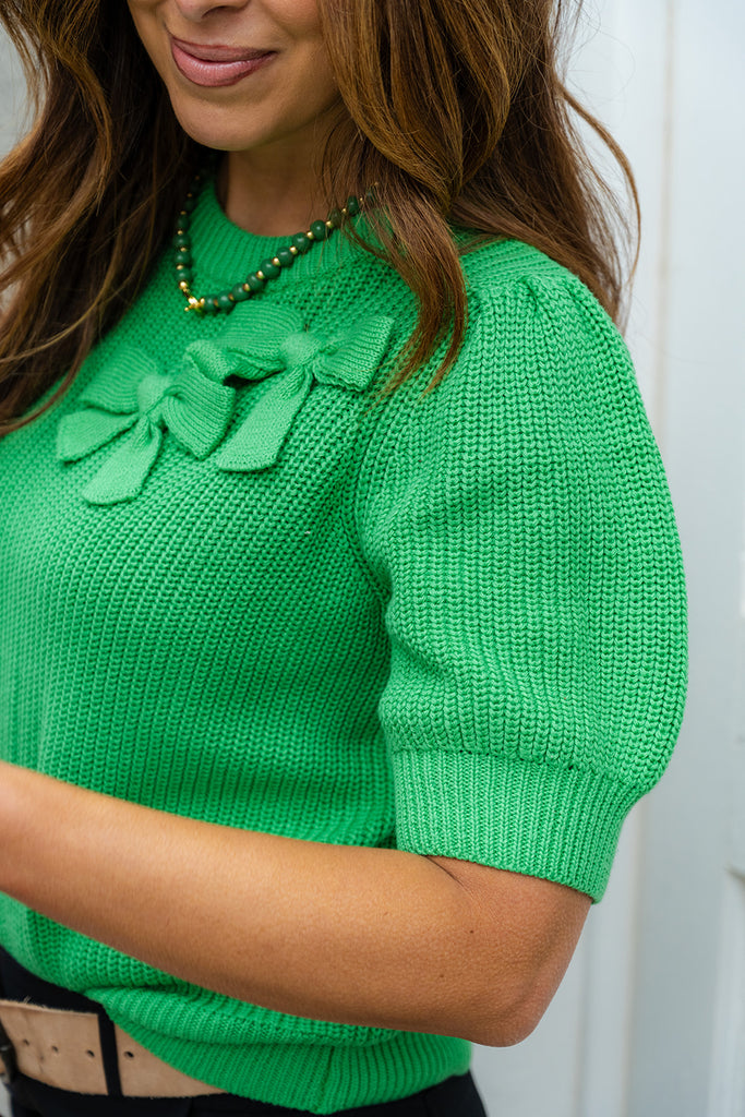 Knit sweaters aren’t just for the cooler months! This tee can easily be paired with shorts or a skirt for the warmer ones too! We love the fun bow accents and puff sleeves of this tee! Add a cardigan, blazer, or jacket for the cooler months.