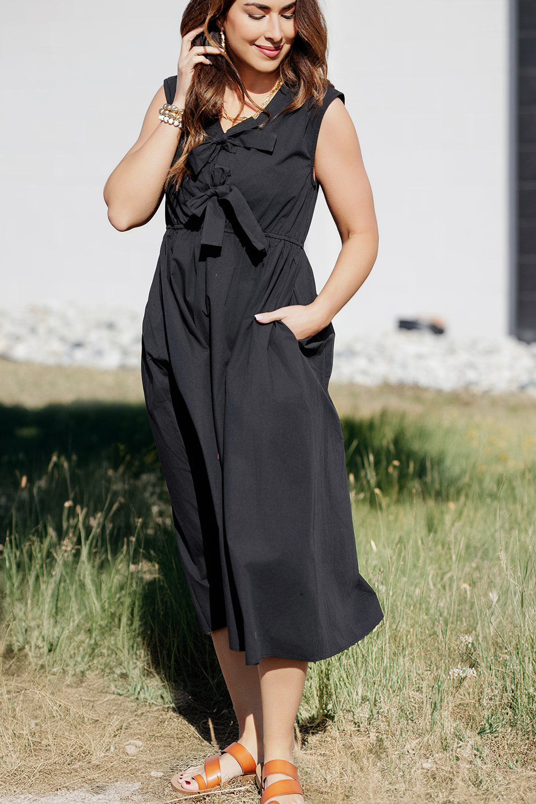 Everything about this midi is absolutely stunning! The flowy bottom, bow accents, midi length, and the classy blouse-like material elevate this dress! Wear alone with a fun pair of earrings or a statement necklace or pair with a cardigan or denim jacket for those breezy days!