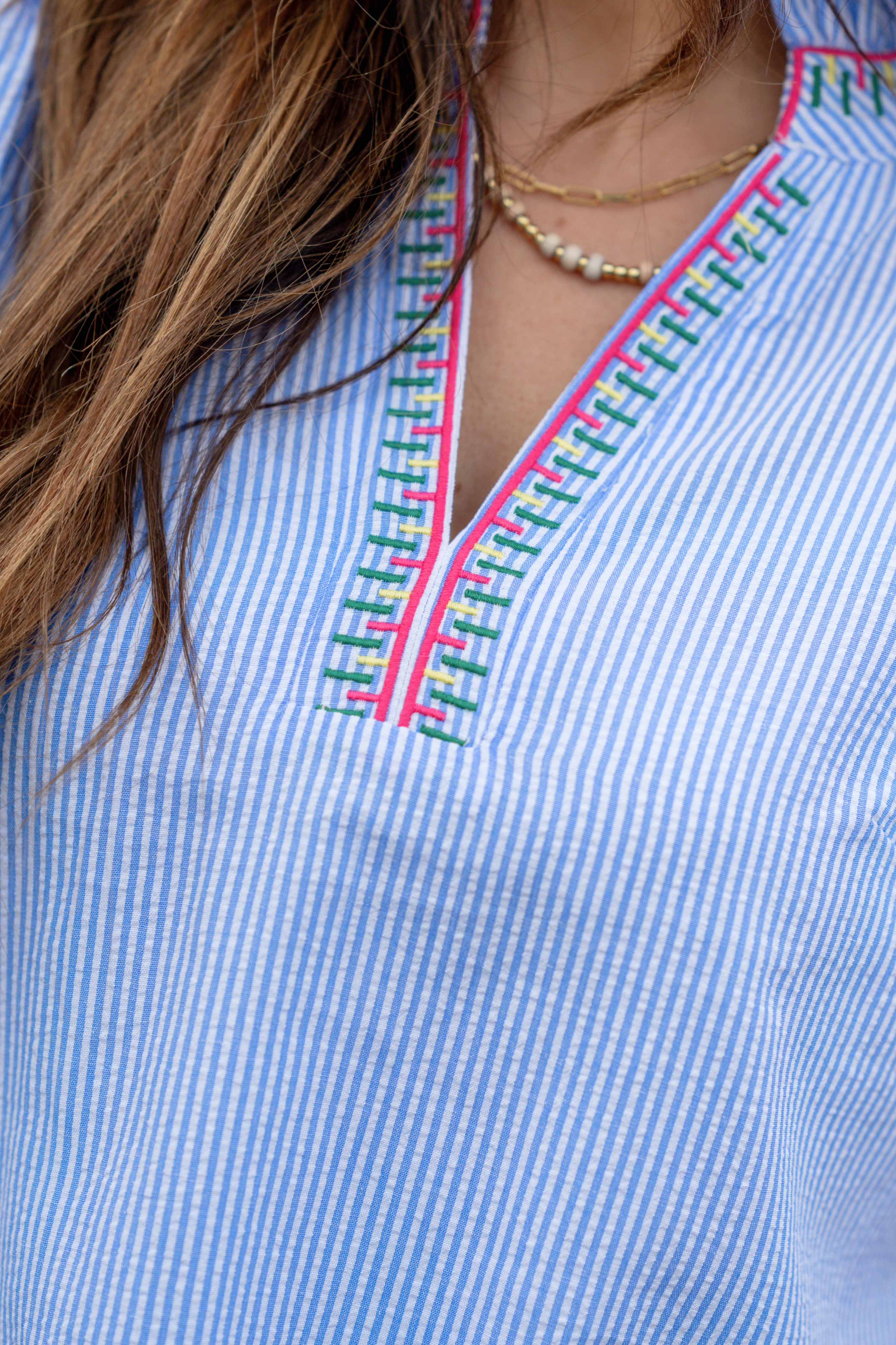 Fresh, fun, and full of charm—this striped popover top is the perfect blend of classic and playful. The puff sleeves add a feminine touch, while the colorful stitched trim at the neckline brings a bold, eye-catching detail.