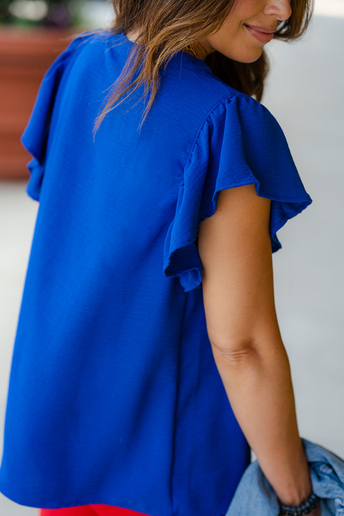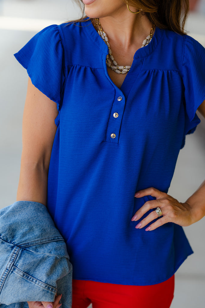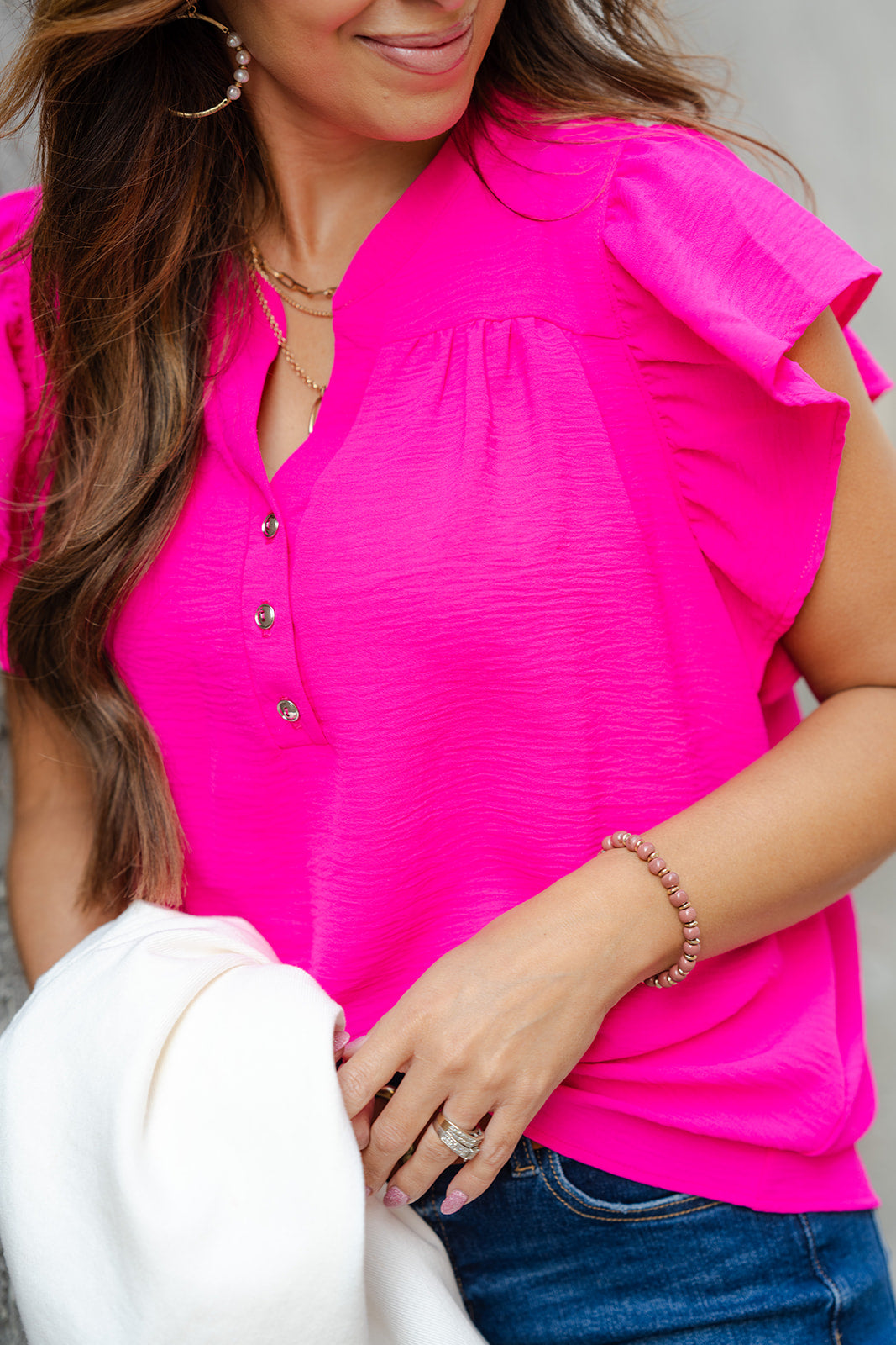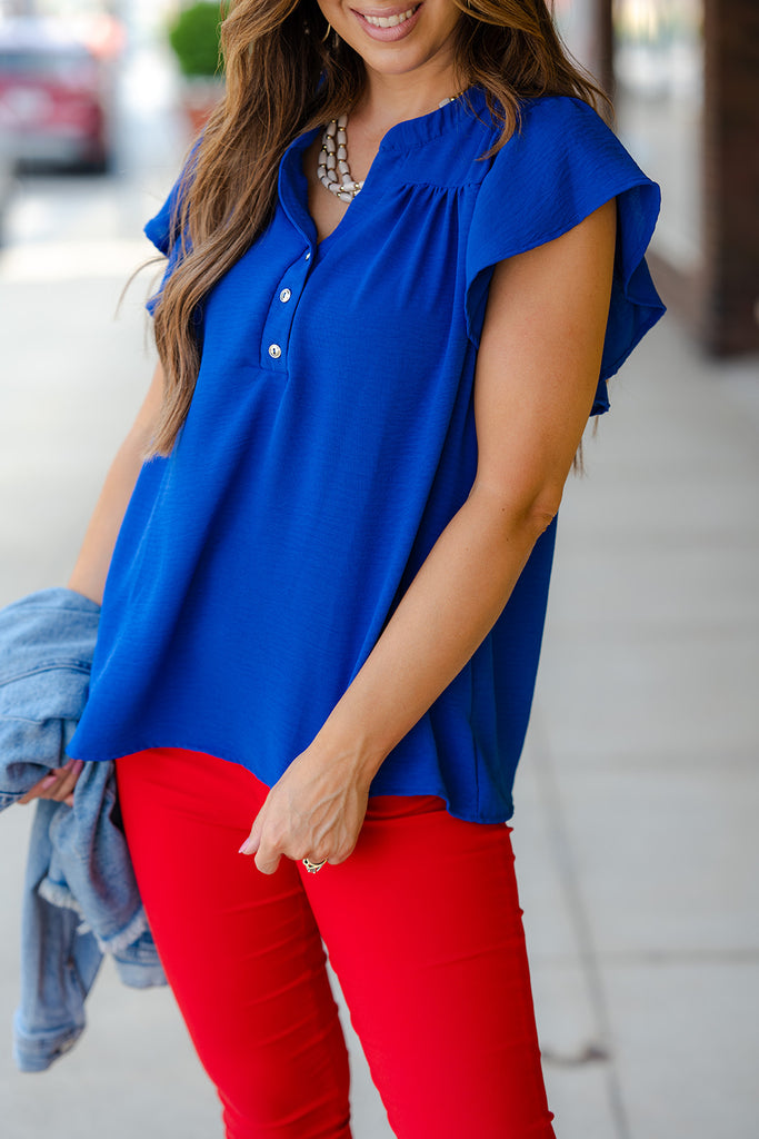 A blouse that's perfect for everyday wear with its fun fluttery sleeves and button-top detailing! The lightweight and breathable material makes this ideal for the warmer months with shorts or a skirt but this can be layered for the cooler ones as well! The simplicity of this blouse allows you to dress this up or down with ease!