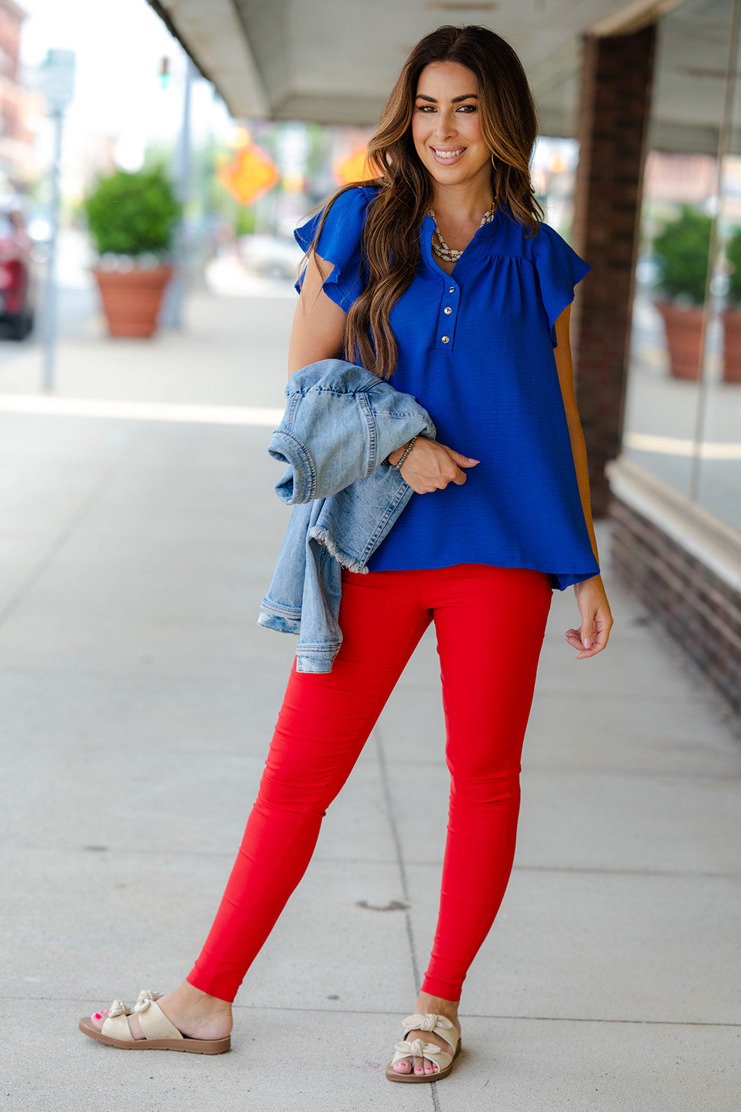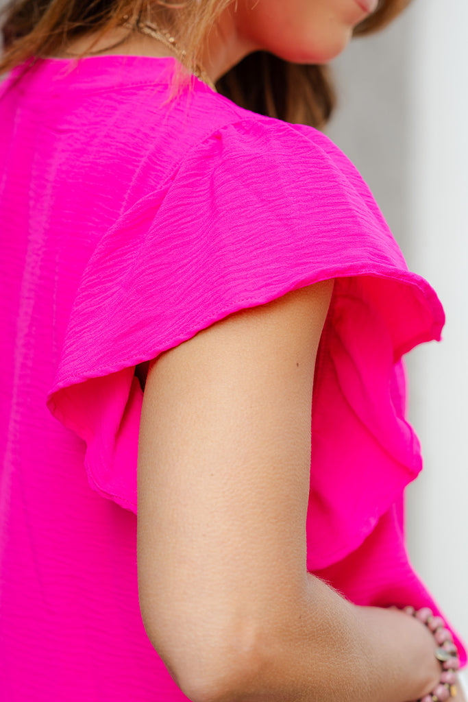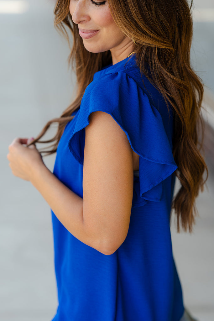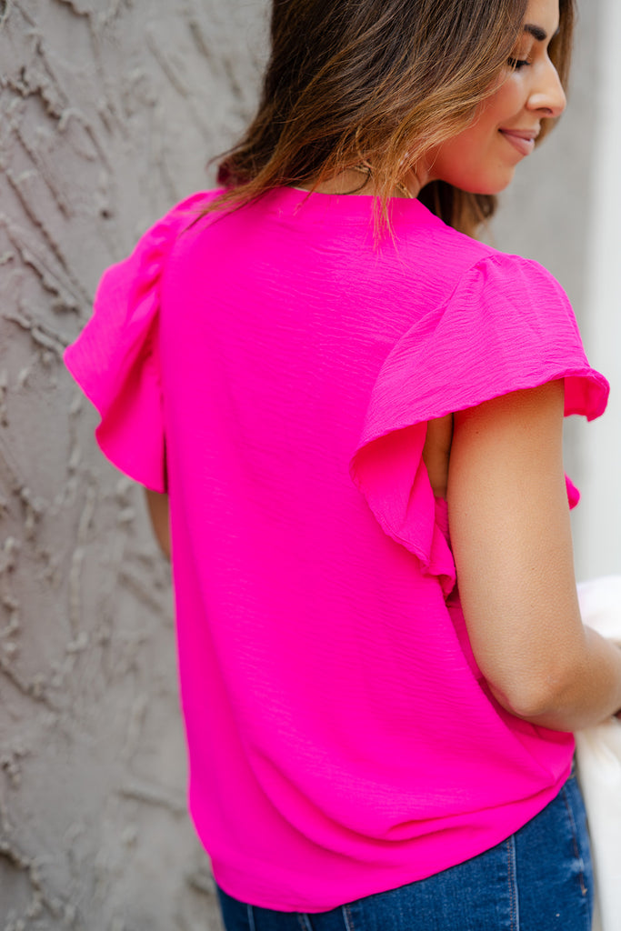 A blouse that's perfect for everyday wear with its fun fluttery sleeves and button-top detailing! The lightweight and breathable material makes this ideal for the warmer months with shorts or a skirt but this can be layered for the cooler ones as well! The simplicity of this blouse allows you to dress this up or down with ease!