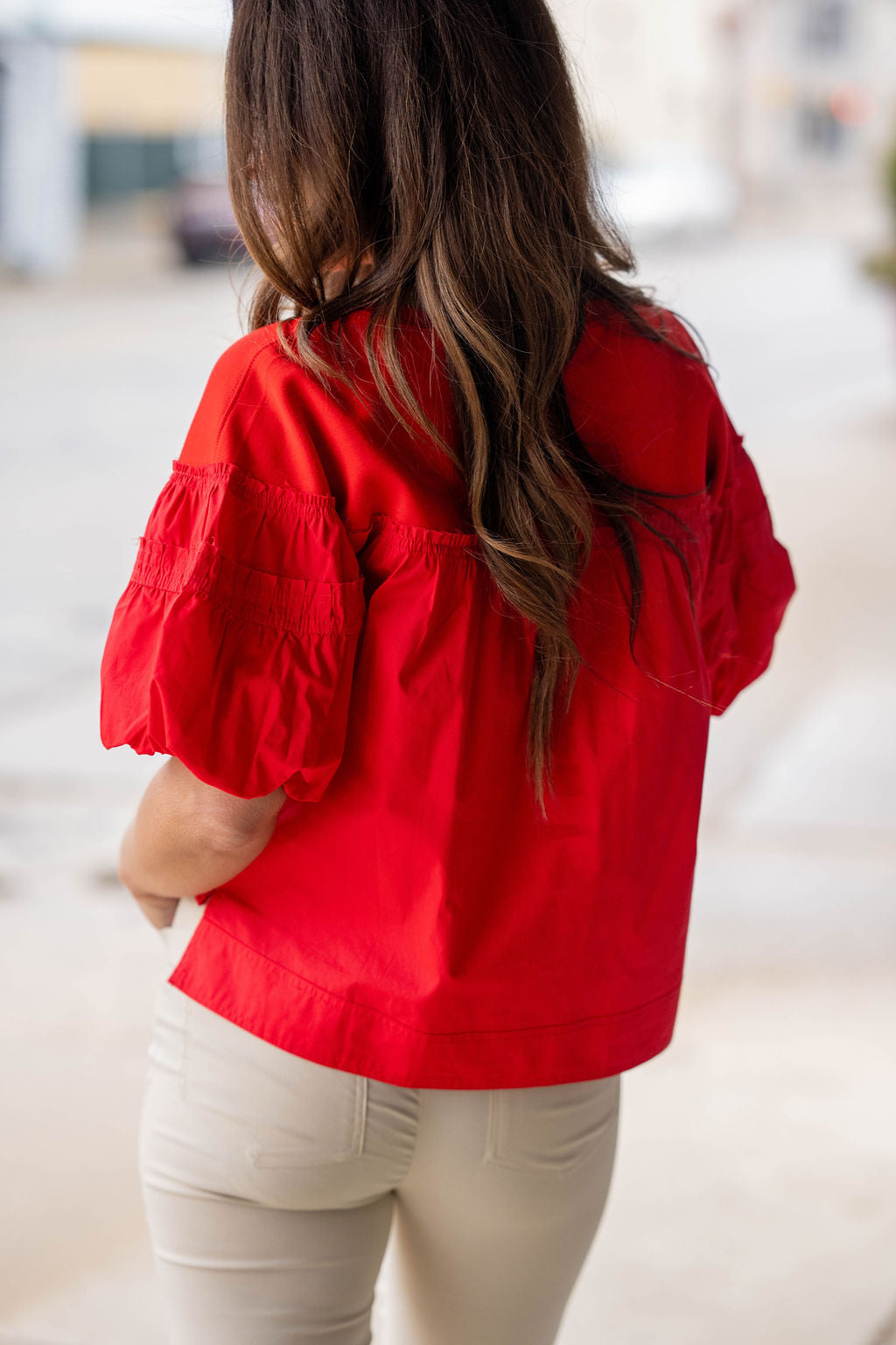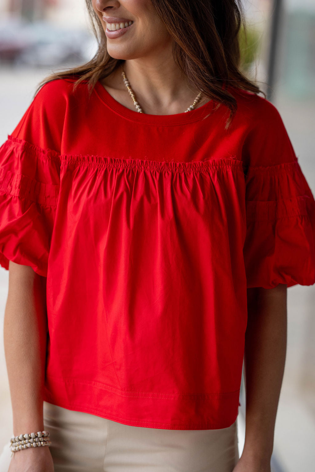 Sweet, effortless, and full of feminine charm — this top is the perfect way to elevate your everyday look. Designed with soft gathered detailing across the chest and statement puff sleeves, it creates a flattering silhouette while adding just the right amount of playful texture.