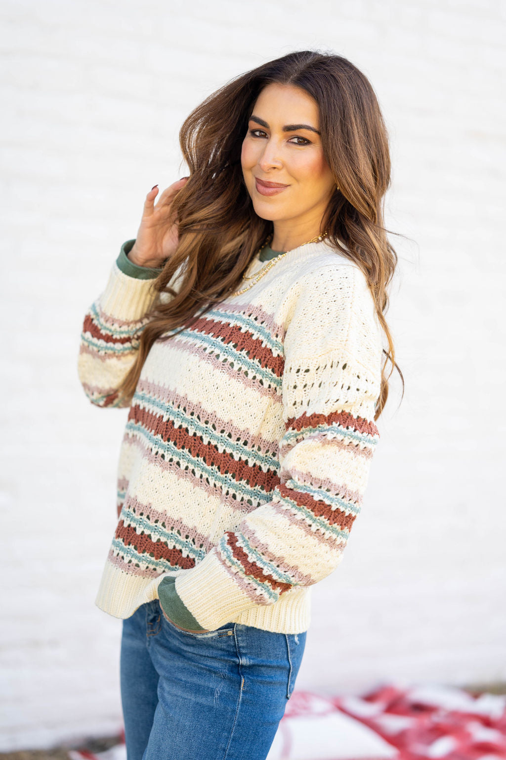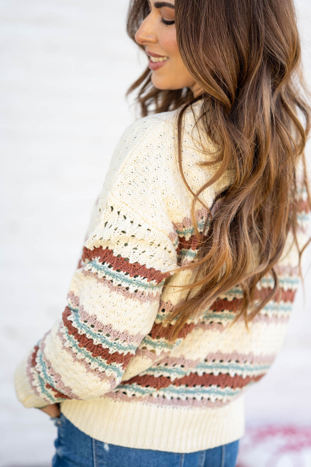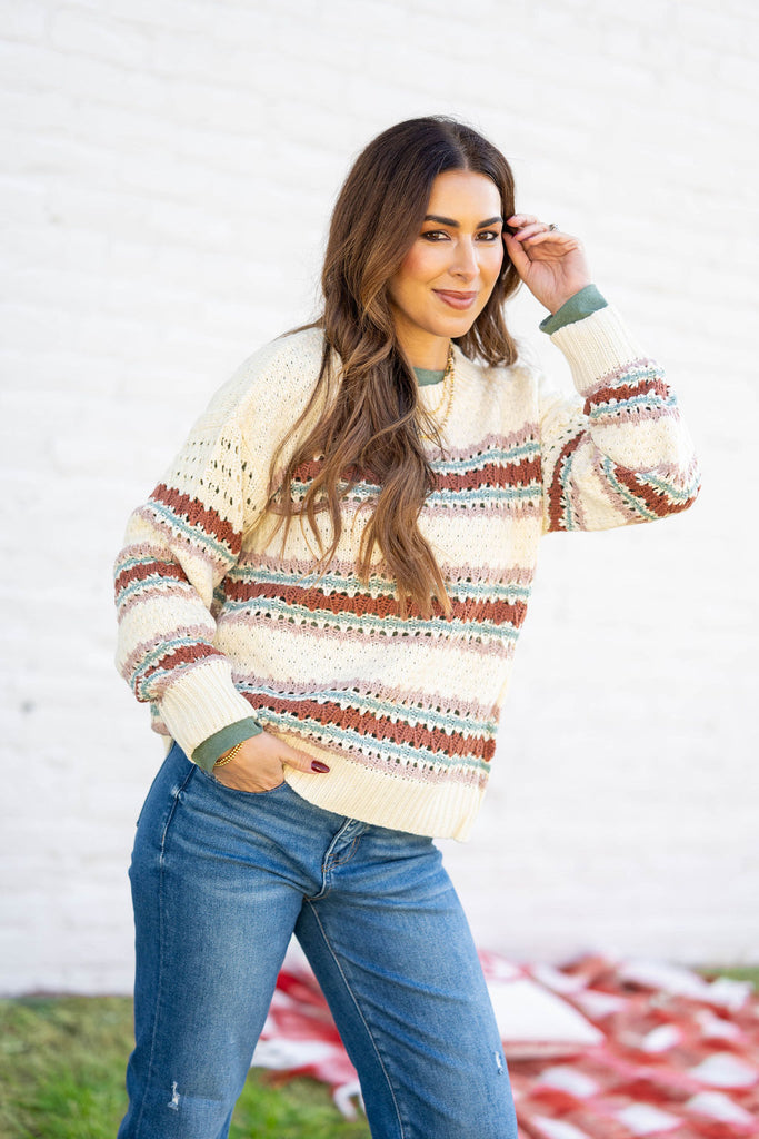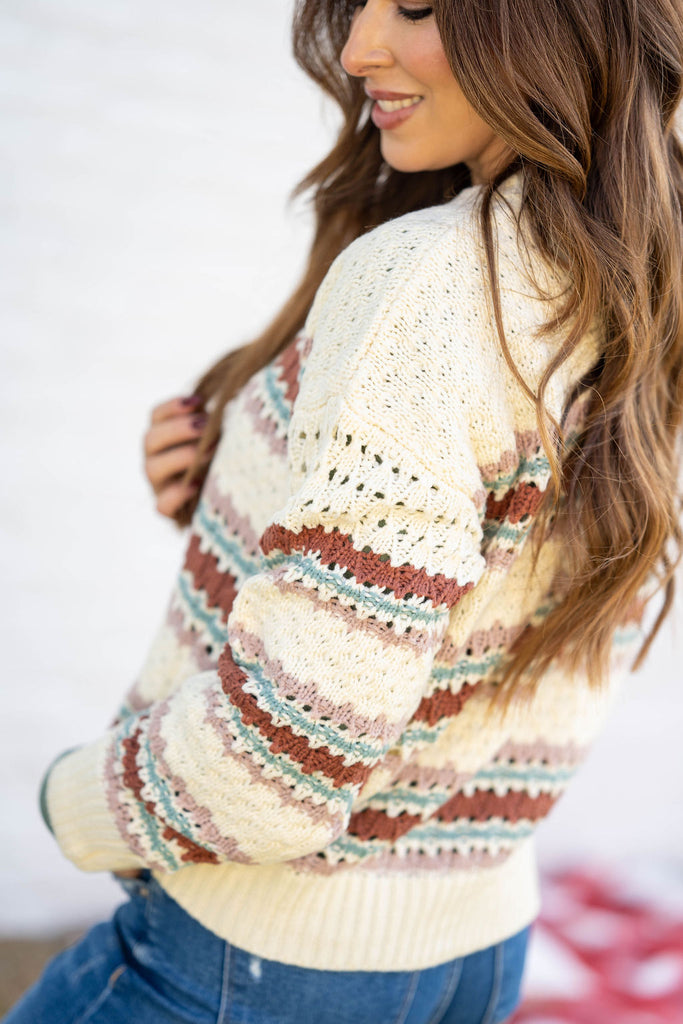 The woven knitted details and assorted stripes of this sweater has us swooning! Pair with your favorite denim or leggings for a quick, everyday look or with a pair of our Betsey's Jeggings and a statement necklace for a more elevated look!