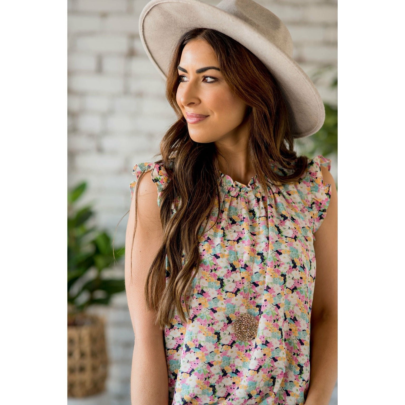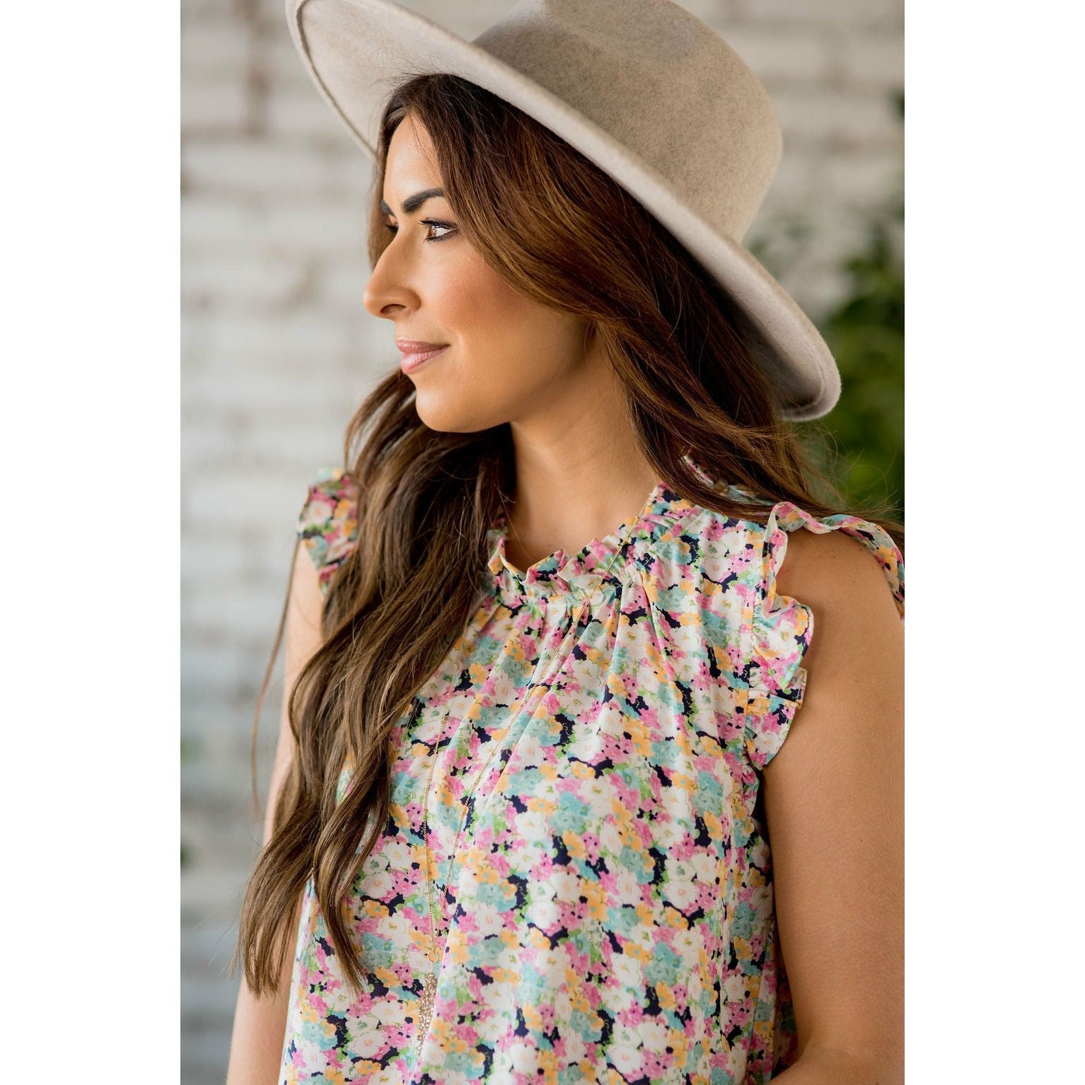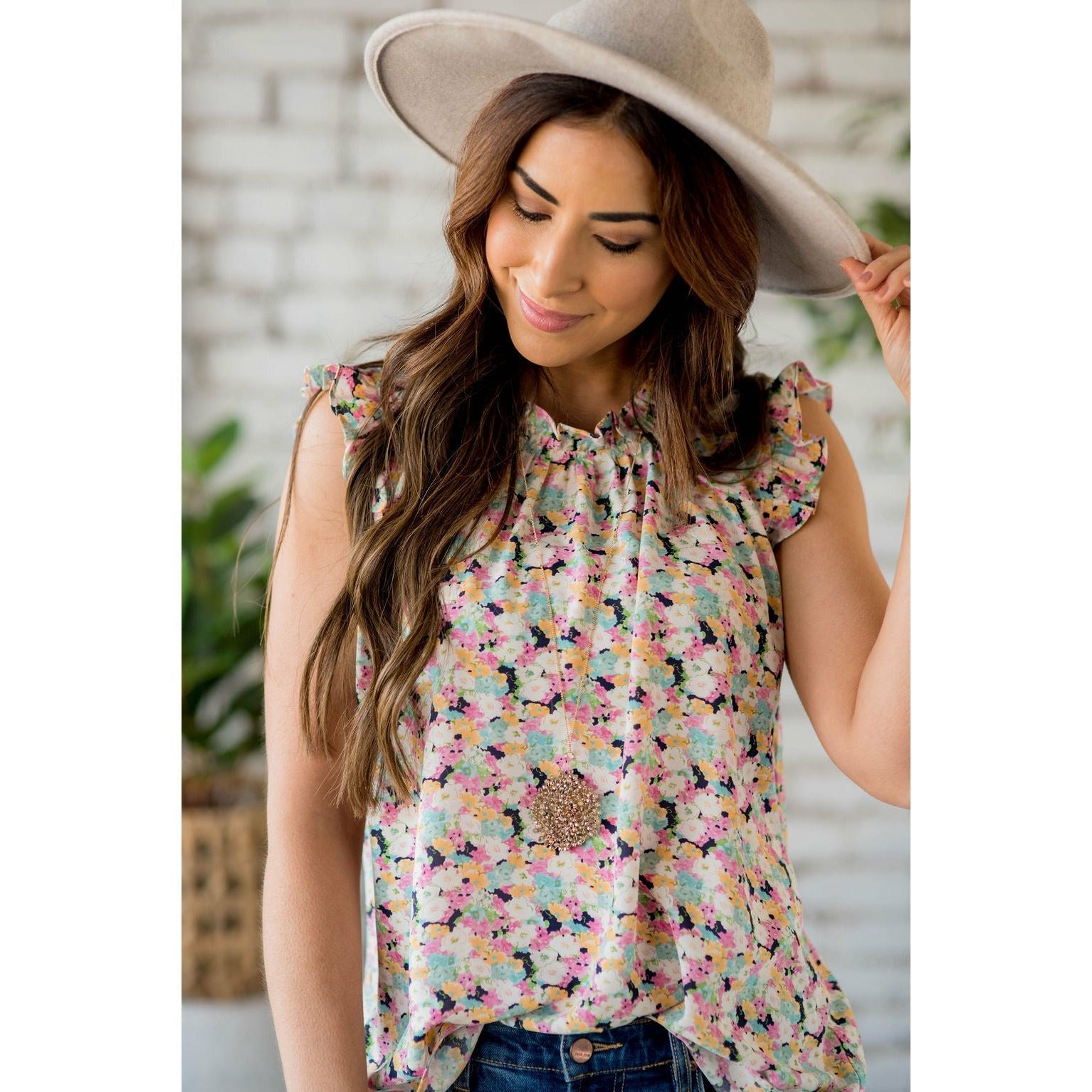 Upgrade your warm weather wardrobe with this colorful tank! The cinched neck and ruffled shoulders create a sophisticated look! Pair this tank with jeans or dress pants for the perfect office look!